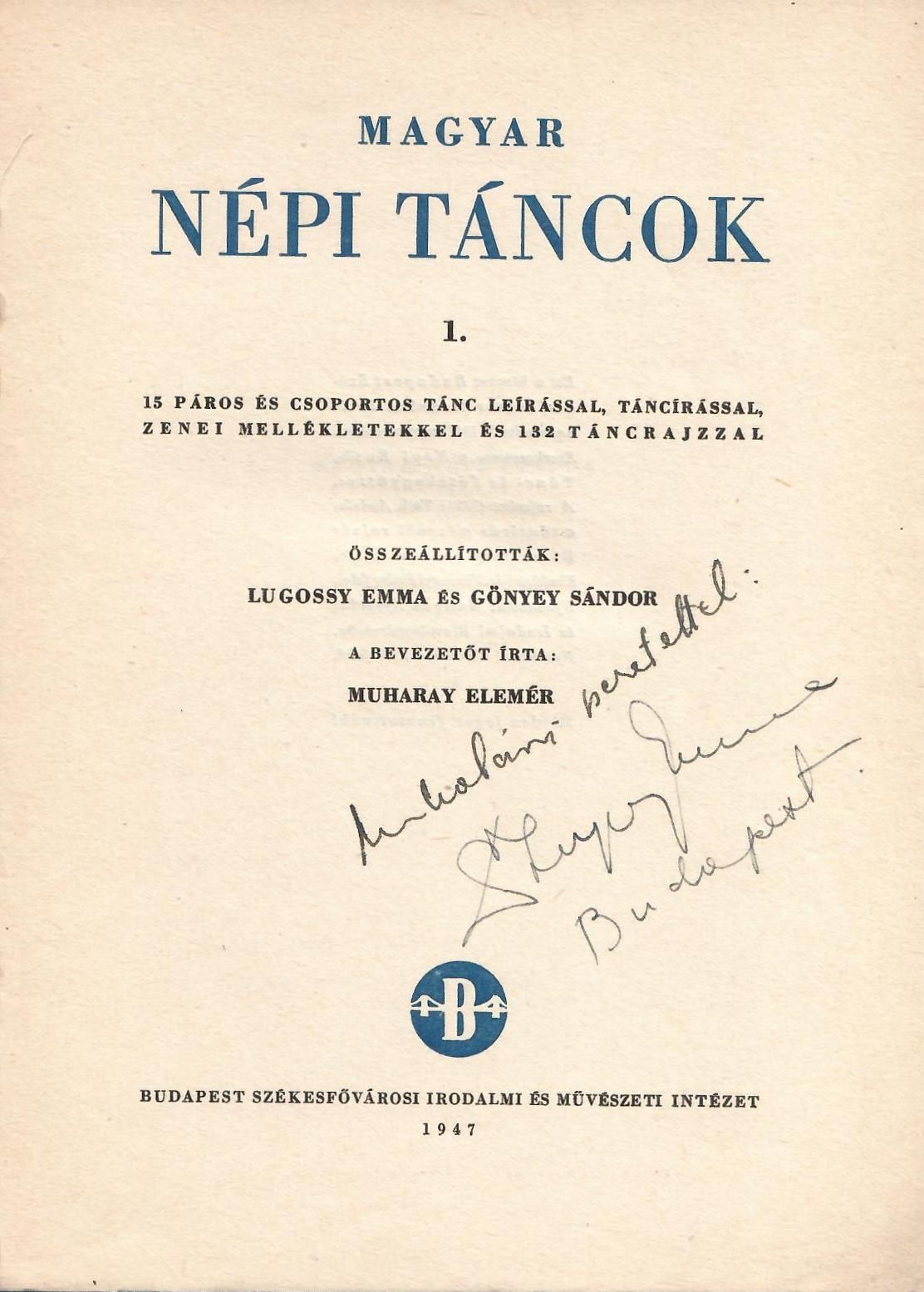 Lugossy, Emma. Magyar nepi tancok : 1 / osszeallitottak: Lugossy Emma es Gonyey Sandor ; a bevezetot irta: Muharay Elemer. – Budapest : Budapest Szekesfovarosi Irodalmi es Muveszeti Intezet, 1947. – (Magyar Muveltseg Konyvtara).