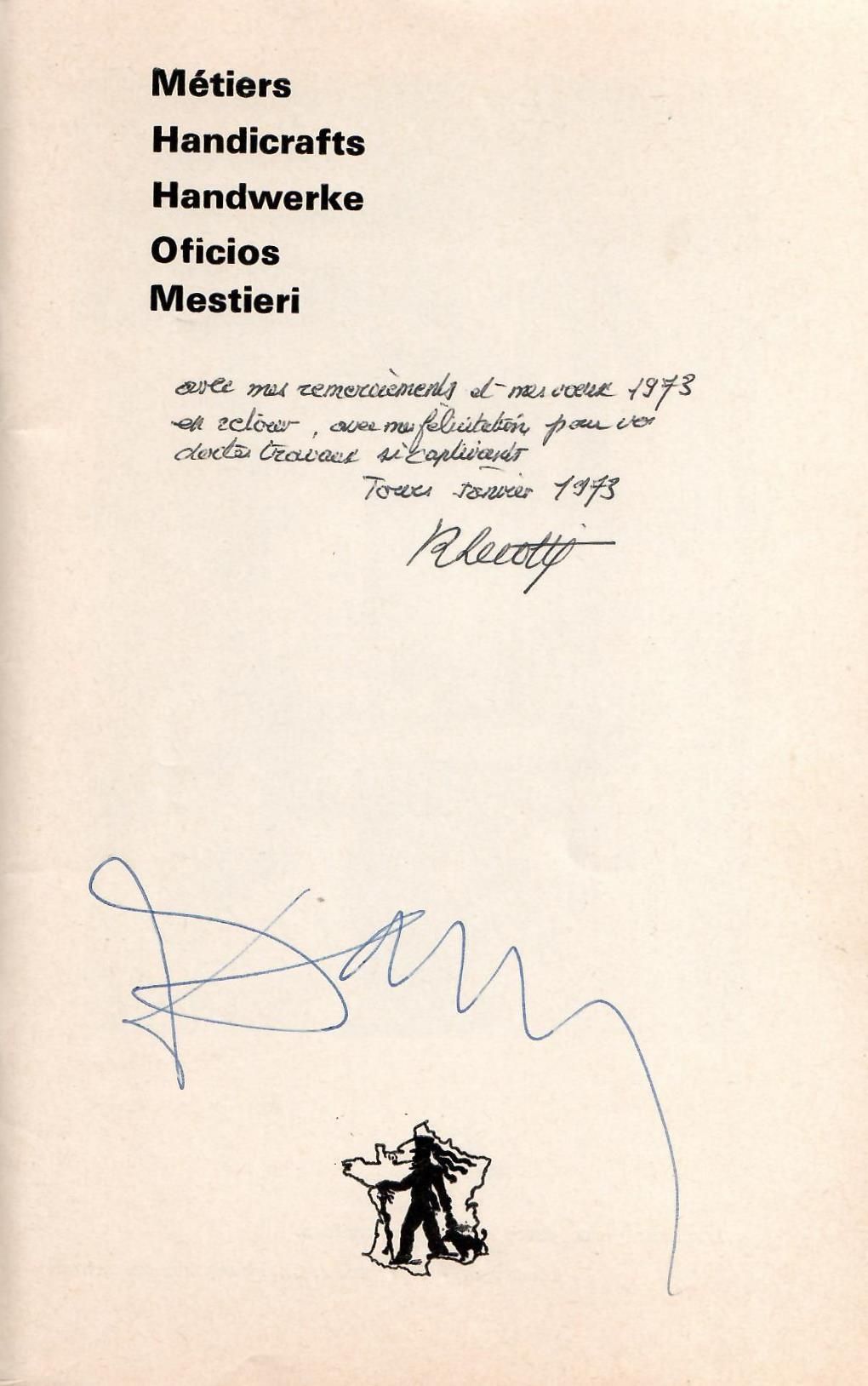 Описание : Екземпляр с дарствен надпис на френски език: "avec mes remerciements et mes voeux 1973 en retour, avec mes felicitations pour vos doctes travaux si captivants. Tours Janvier 1973. R. Lecotte" (с моите благодарности и моите пожелания за 1973 г. в отговор, с моите поздравления за Вашите тъй увлекателни научни трудове. Тур, януари 1973 г. Р. Льокоте). Посвещението е от Роже Льокоте (основател на Музея на занаятчийските общности в Тур) за българския му колега проф. Христо Вакарелски. Пътеводителят представя историята и традициите на френските занаятчийски гилдии (compagnonnage). Дигиталният обект е предназначен само за лично ползване.