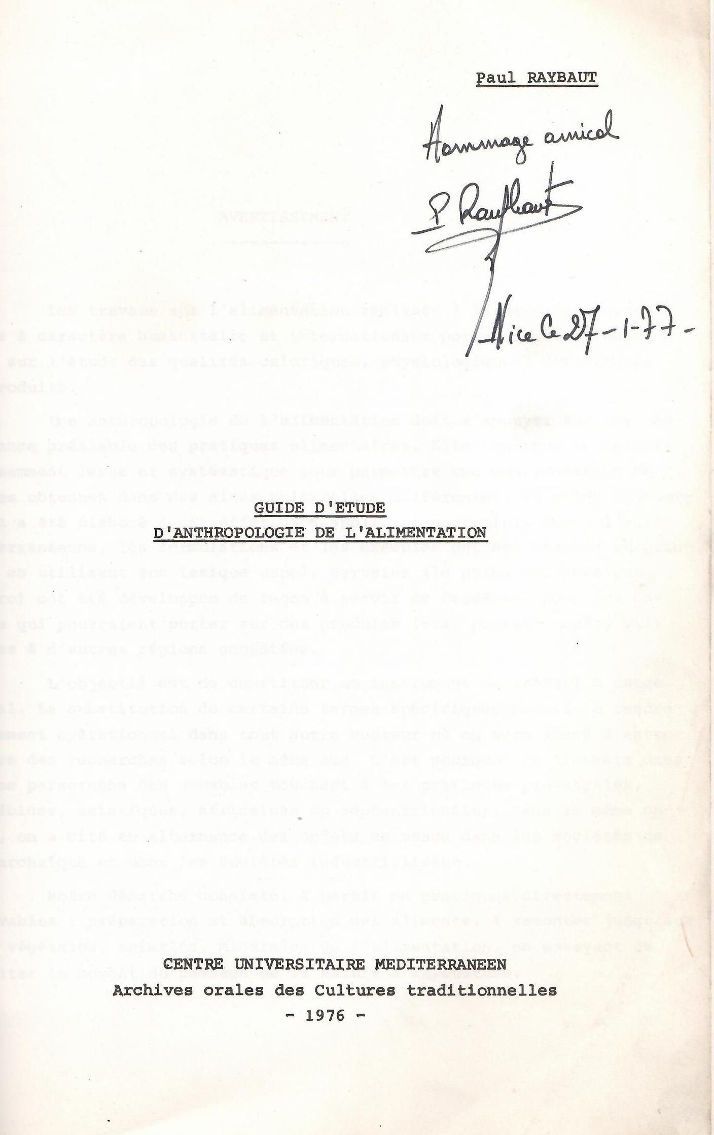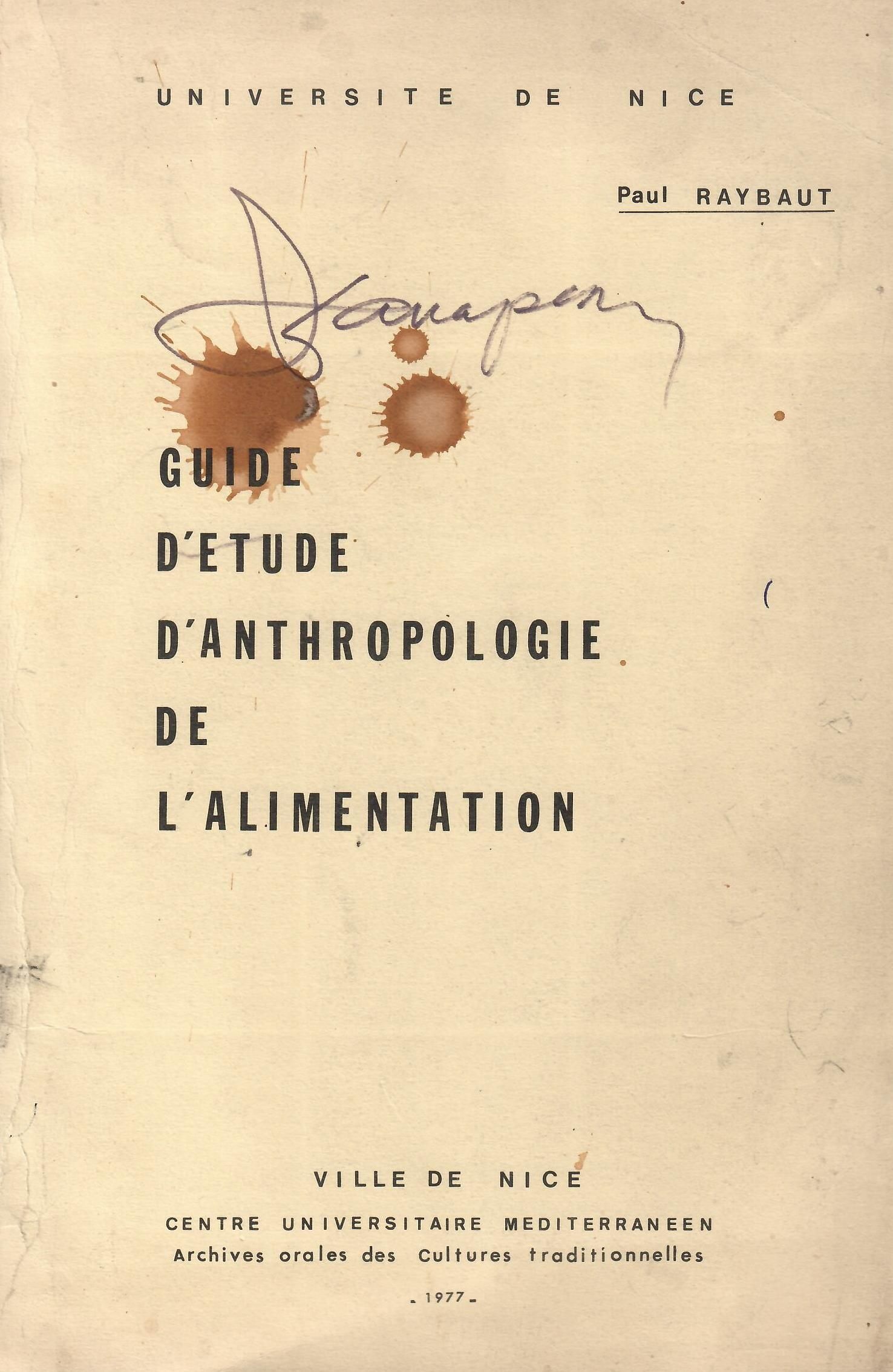 Guide d’etude d’anthropologie de l’alimentation / Paul Raybaut ; Universite de Nice, Centre Universitaire Mediterraneen, Archives orales des Cultures traditionnelles. – Nice : Ville de Nice, 1977.