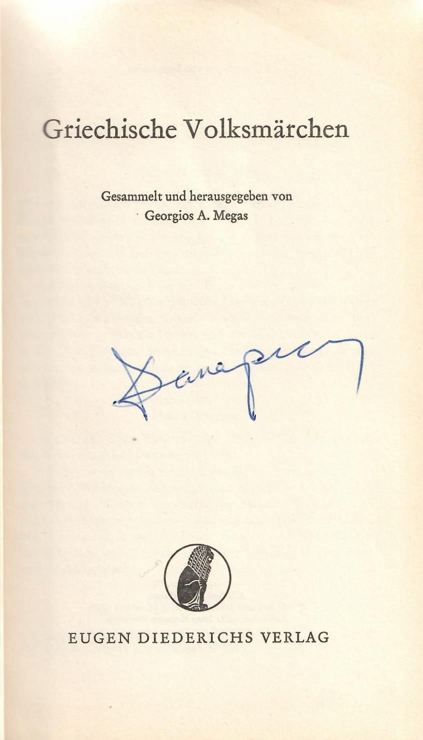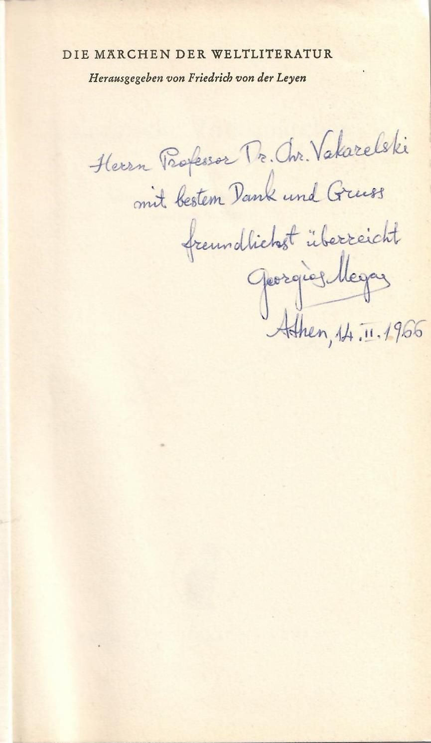 Описание : Екземпляр с дарствен надпис на немски език: „Herrn Professor Dr. Chr. Vakarelski mit bestem Dank und Gruss freundlichst uberreicht Georgios Megas Athen, 14. III. 1966“ (На господин професор д-р Хр. Вакарелски с най-добри благодарности и поздрави, приятелски предадена от Георгиос Мегас. Атина, 14. III. 1966 г.). Посвещението е от видния гръцки фолклорист Георгиос Мегас за българския му колега проф. Христо Вакарелски. Книгата е сборник с гръцки народни приказки от поредицата „Приказките на световната литература“. Дигиталният обект е предназначен само за лично ползване.
