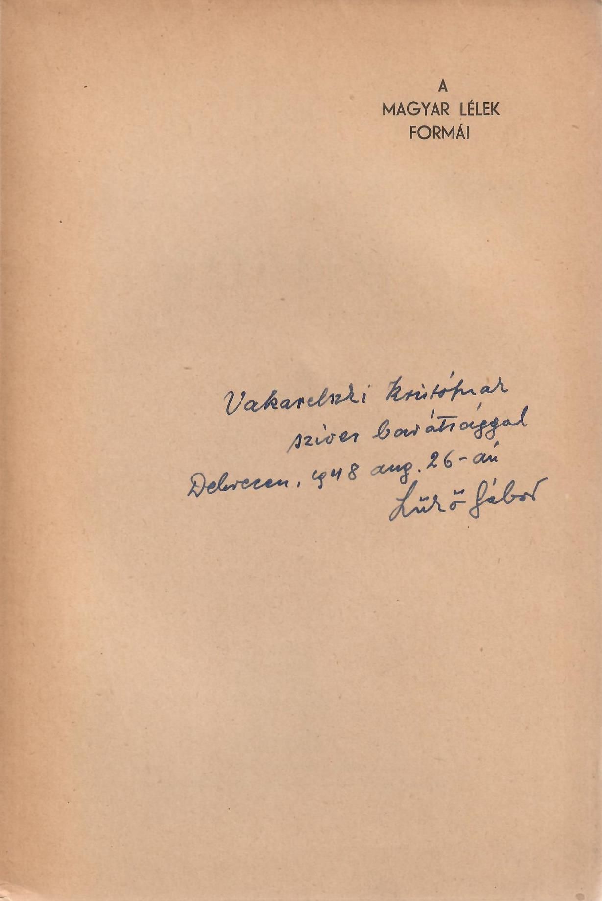 Описание : Екземпляр с дарствен надпис на унгарски език: „Vakarelski Kristofnak szives baratsaggal. Debrecen, 1948 aug. 26-an. Luko Gabor“ (На Христо Вакарелски с искрено приятелство. Дебрецен, 26 август 1948 г. Гюбор Люкьо). Посвещението е от унгарския етнограф и фолклорист Гюбор Люкьо за българския му колега проф. Христо Вакарелски. Книгата „Формите на унгарската душа“ е фундаментално изследване в областта на народната психология и етнография. Дигиталният обект е предназначен само за лично ползване.