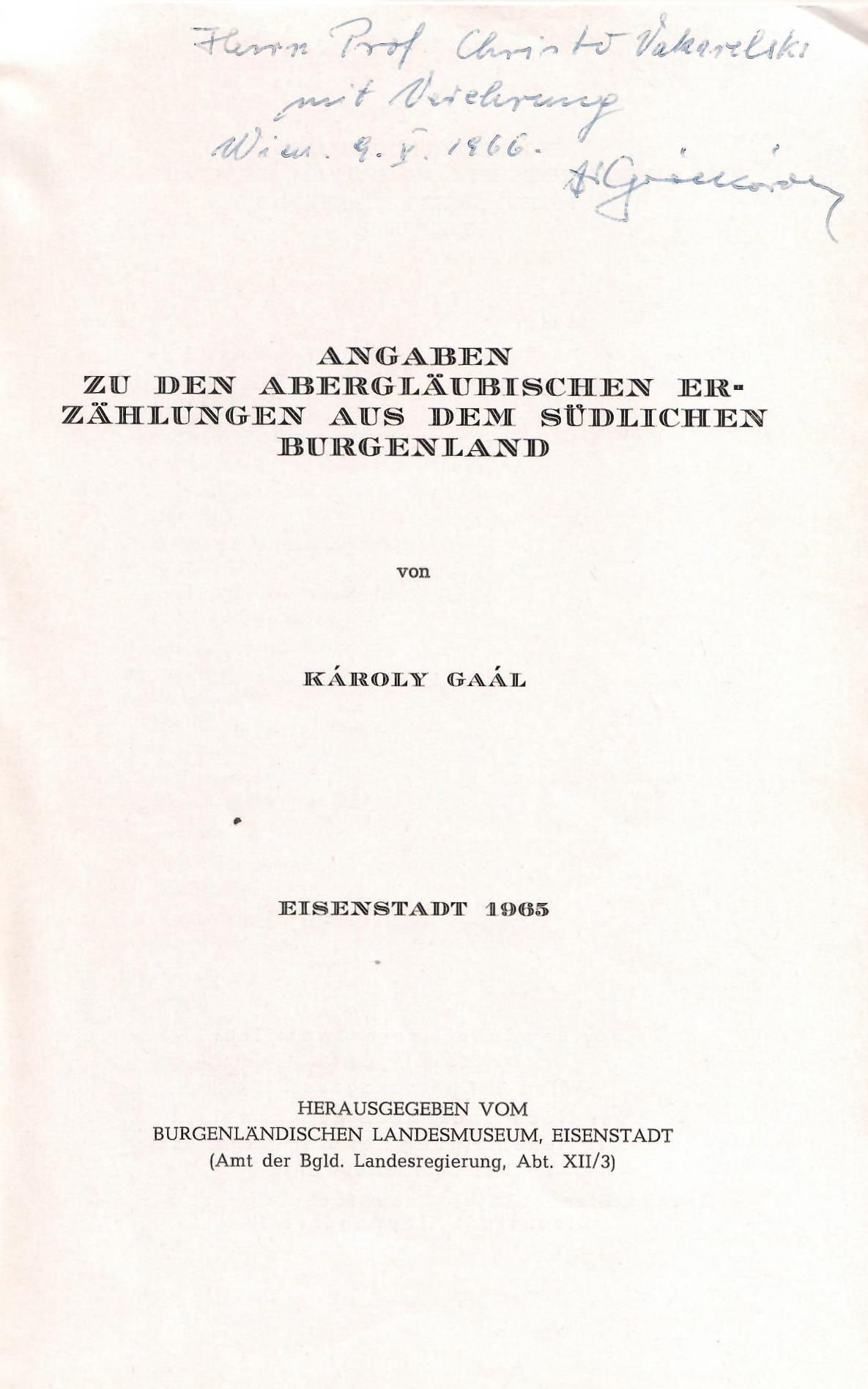 Angaben zu den aberglaubischen Erzahlungen aus dem sudlichen Burgenland / Karoly Gaal ; Herausgegeben vom Burgenlandischen Landesmuseum in Eisenstadt. – Eisenstadt : Burgenlandisches Landesmuseum, 1965. – (Wissenschaftliche Arbeiten aus dem Burgenland ; Heft 33).