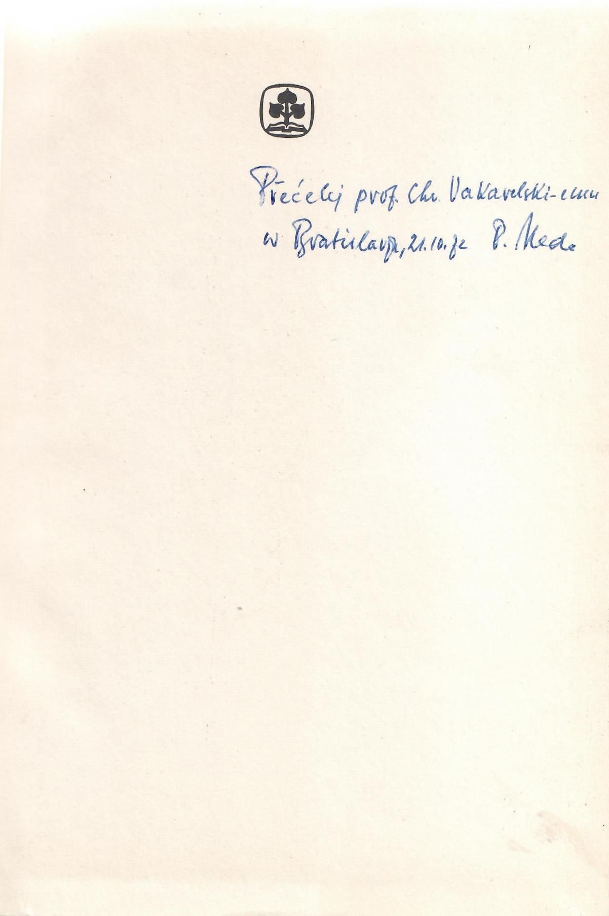 Описание : Екземпляр с дарствен надпис на полски език: "Precelemu prof. Chr. Vakarelskiemu w Bratislawie, 21.10.72 – P. Mede" (На почитаемия проф. Хр. Вакарелски в Братислава, 21.10.72 – П. Меде). *Дигиталният обект е предназначен само за лично ползване.