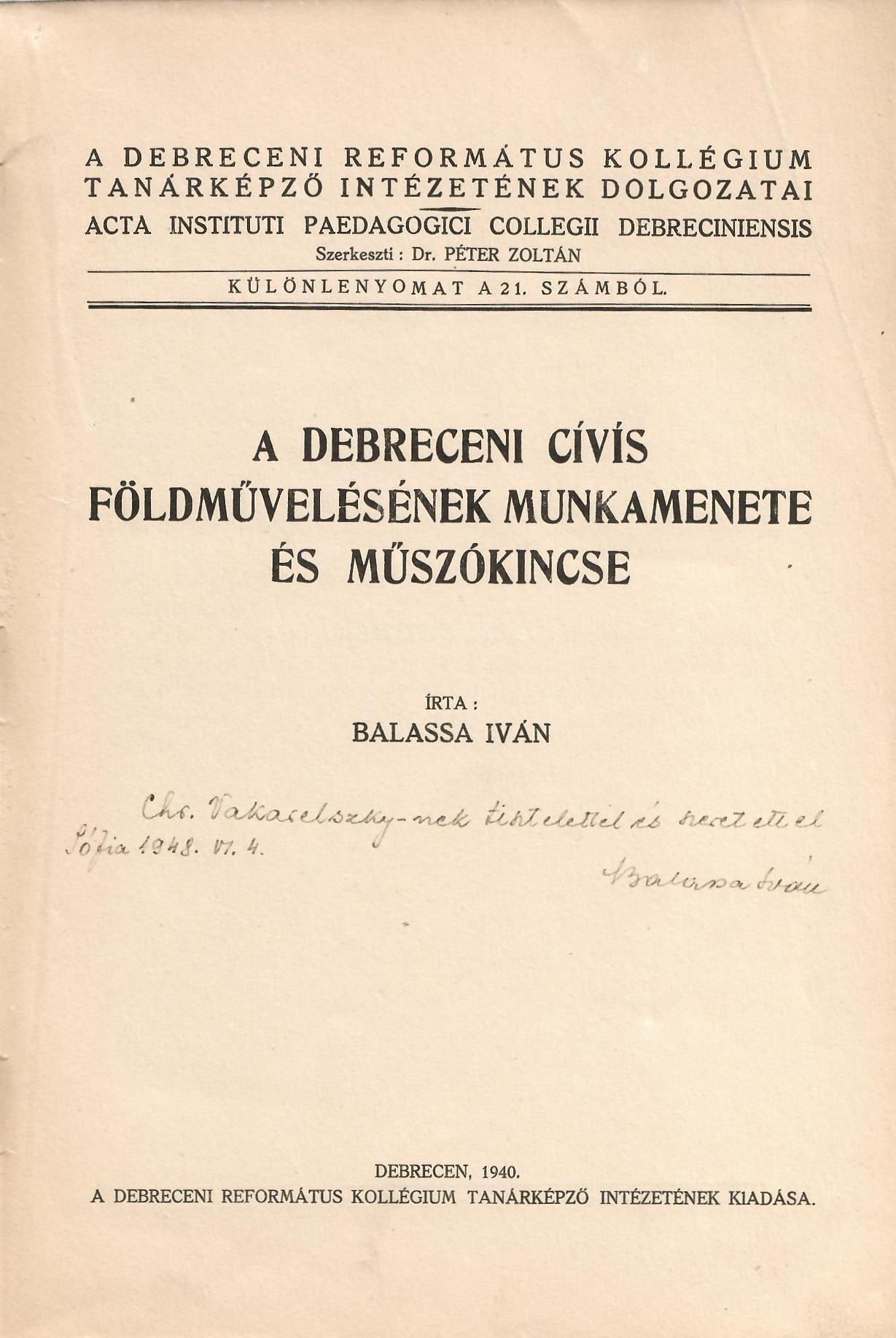 Описание : Екземпляр с дарствен надпис на унгарски език: "Chr. Vakarelskynak tisztelettel es szeretettel – Balassa Ivan, Szofia 1948. VI. 4." (На Хр. Вакарелски с уважение и обич – Иван Балаша, София 1948. VI. 4.). Посвещението е от автора – видния унгарски етнограф Иван Балаша за българския етнограф проф. Христо Вакарелски. Трудът разглежда работния процес и земеделската терминология в района на Дебрецен. Дигиталният обект е предназначен само за лично ползване.