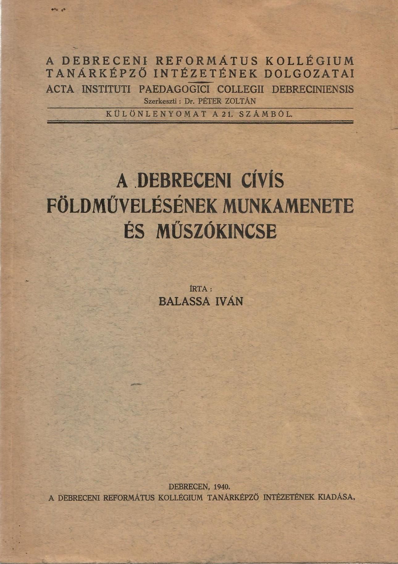 Balassa, Ivan. A debreceni civis foldmuvelesenek munkamenete es muszokincse / irta Balassa Ivan. – Debrecen : A Debreceni Reformatus Kollegium Tanarkepzo Intezetenek Kiadasa, 1940. – (Acta Instituti Paedagogici Collegii Debreciniensis ; 21).