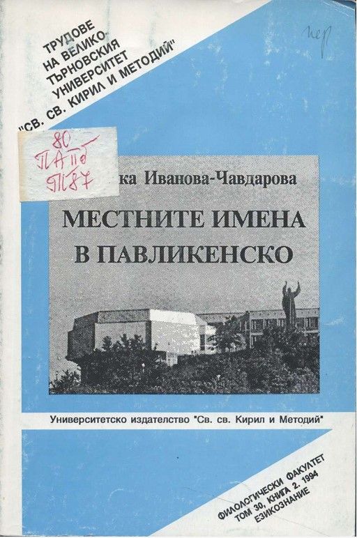 Том 30 Кн.2. Трудове на Великотърновския университет "Св. св. Кирил и Методий". Филологически факултет = Travaux de L'universite St. St. Cyrille et Methode de Veliko Tirnovo. Faculte de philologue Езикознание Местните имена в Павликенско / Недялка Иванова-Чавдарова = Lez noms de lieux le district de Pavlikeni / Nedialka Ivanova-Tchavdarova