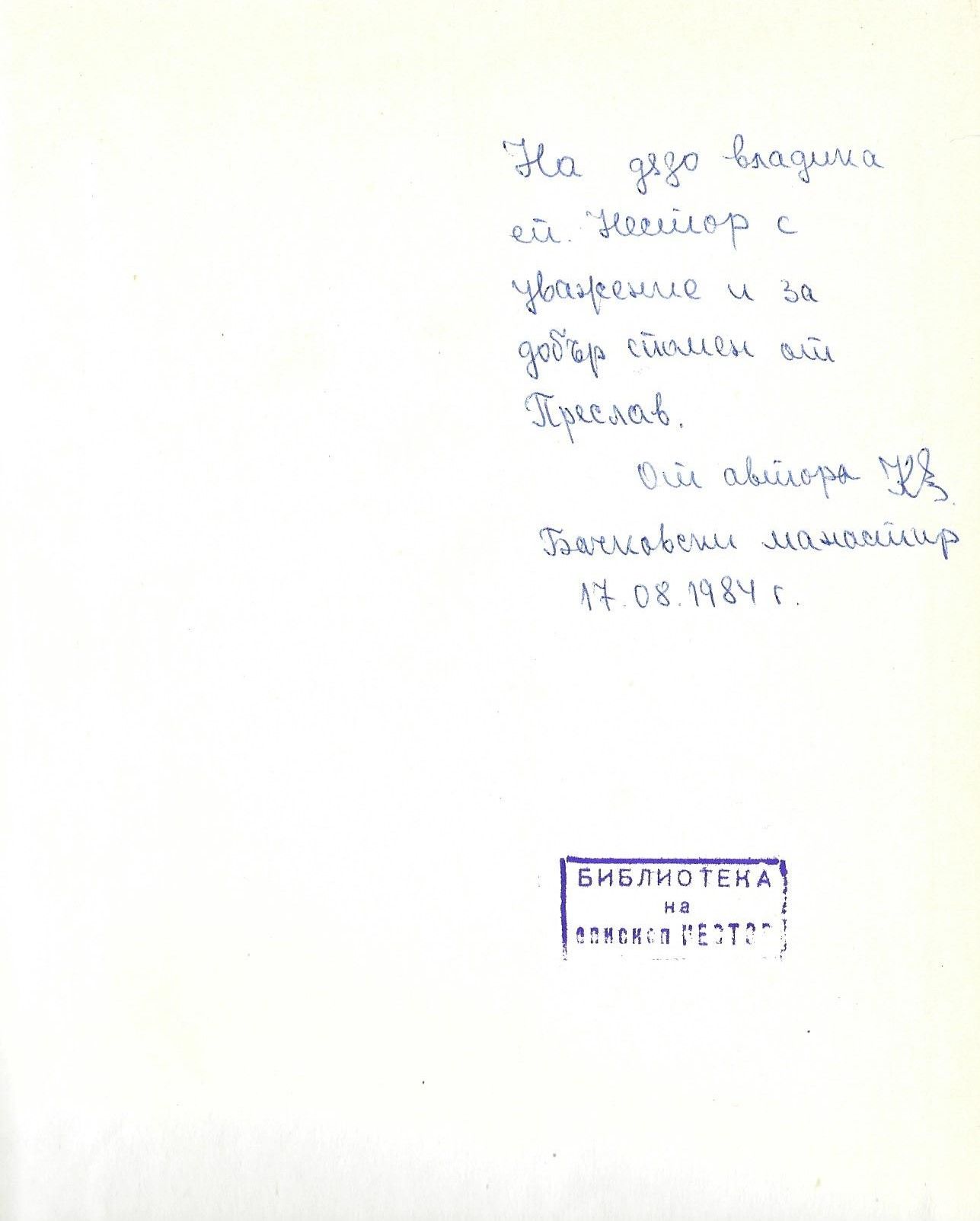 Год.издаване : Бачковски манастир, 17 август, 1984