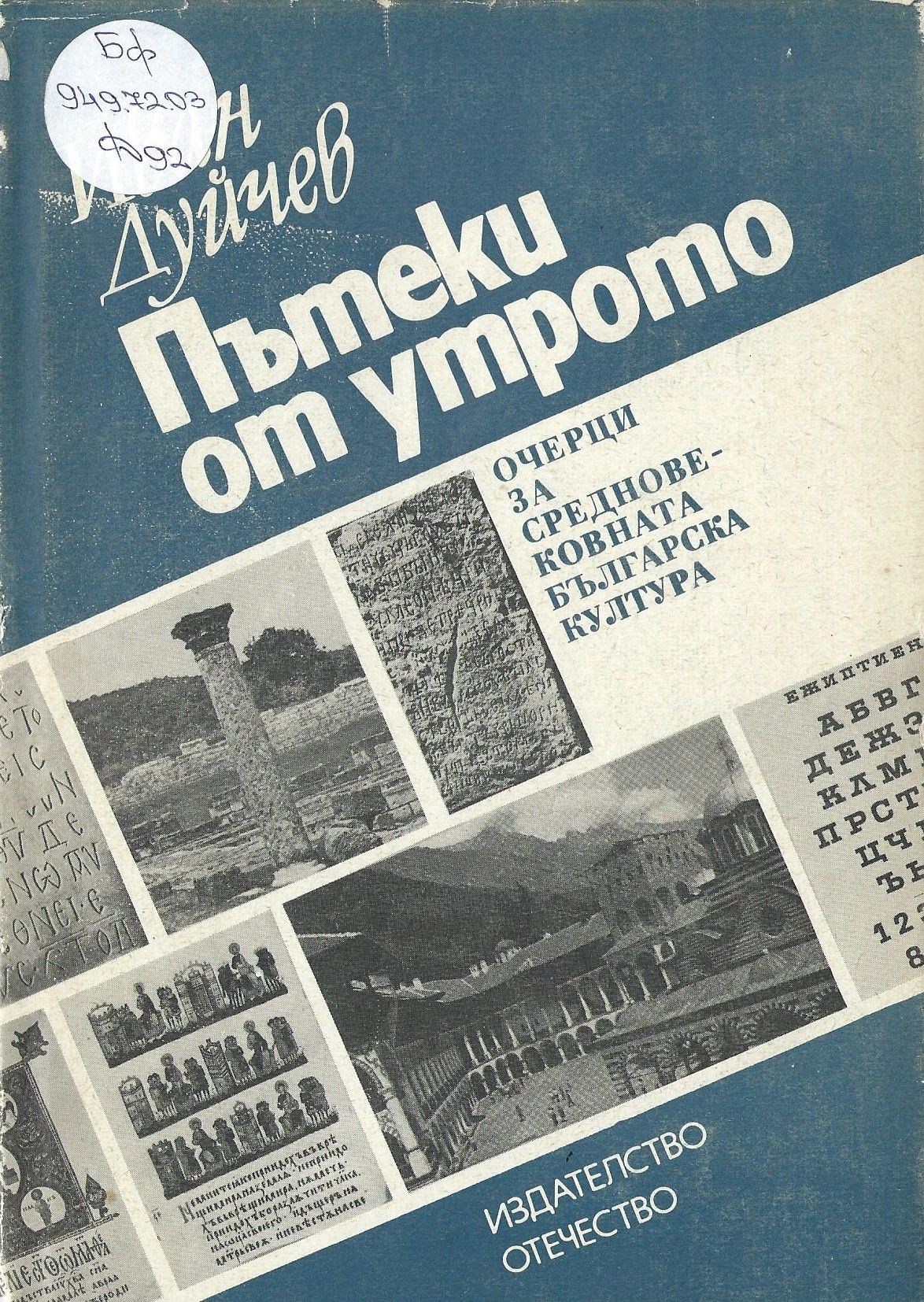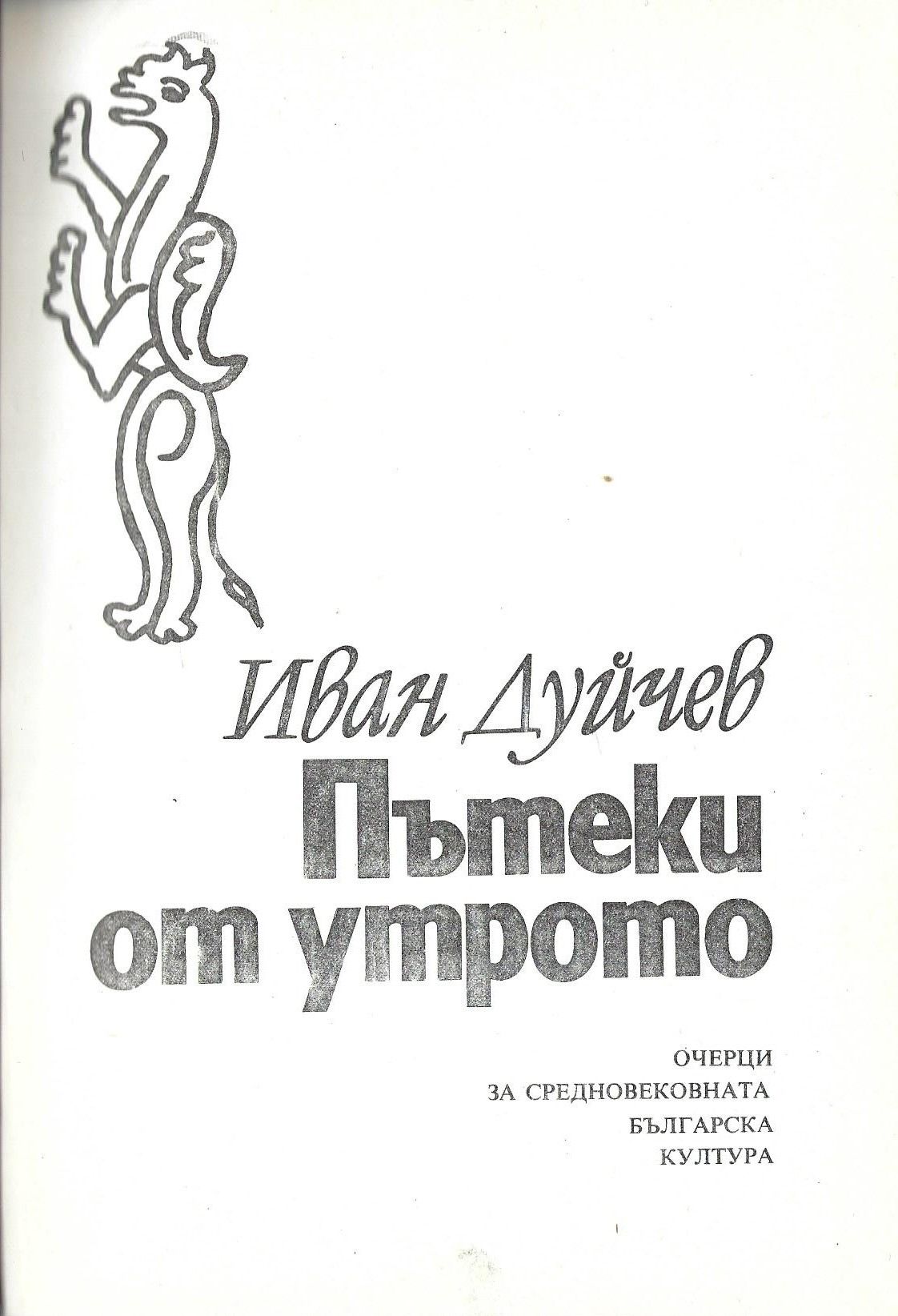 Дуйчев, Иван. Пътеки от утрото : Очерци за средновековната българска култура / Иван Дуйчев. - София : Отечество, 1985. - 255 с. : с ил., факс., портр. ; 22 см.