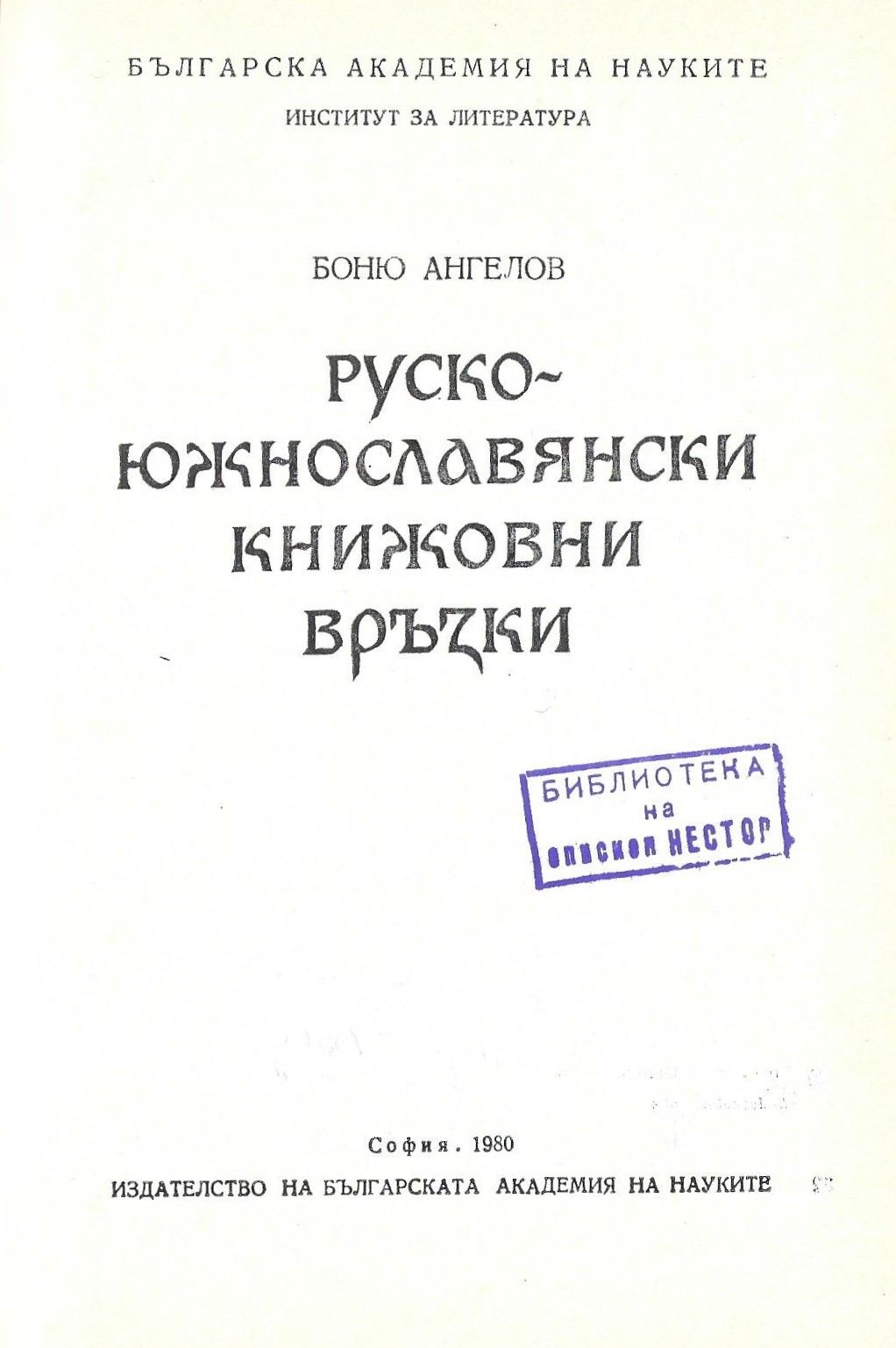Ангелов, Боню. Руско-южнославянски книжовни връзки : [Изследване] / Боню Ангелов. - София : БАН, 1980. - 130 с., : с факс. ; 21 см.