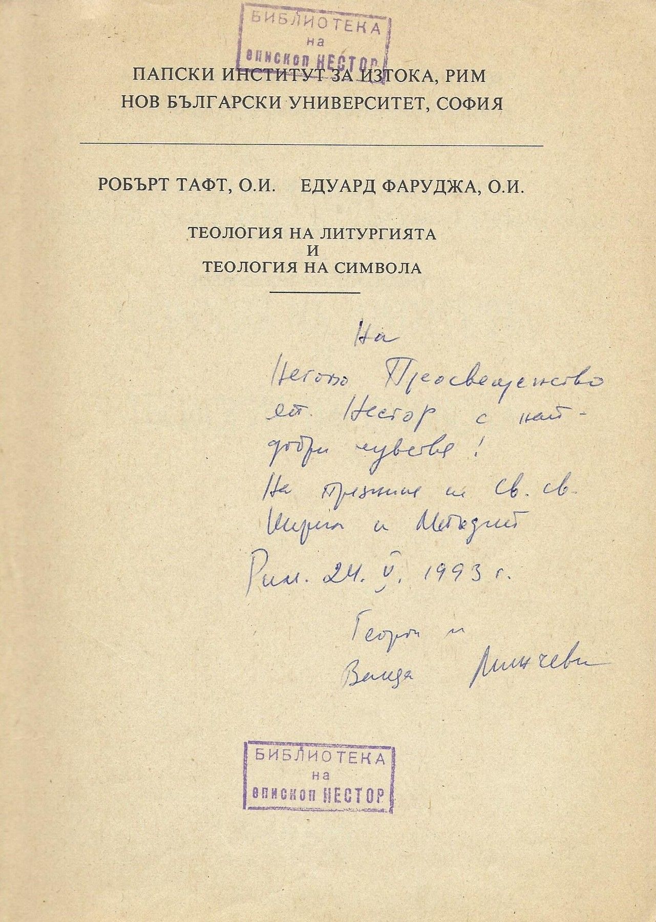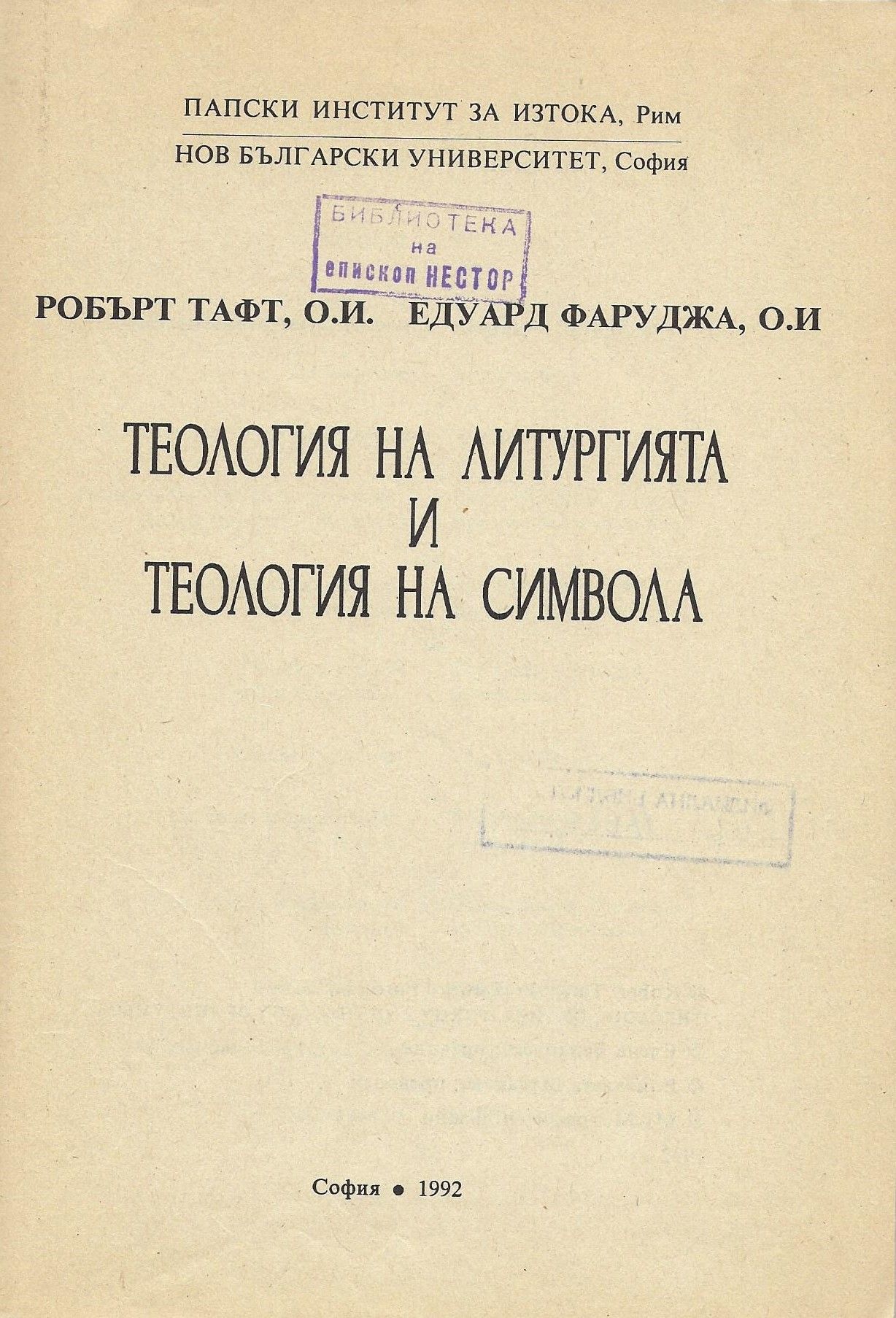 Тафт, Робърт. Теология на литургията и теология на символа : [Лекции] / Робърт Тафт, Едуард Фаруджа ; Прев. от англ. Елена Велковска, Елисавета Мусакова. - Рим и др. : Папски институт за Изтока и др., 1992. - 200 с. ; 23 см.