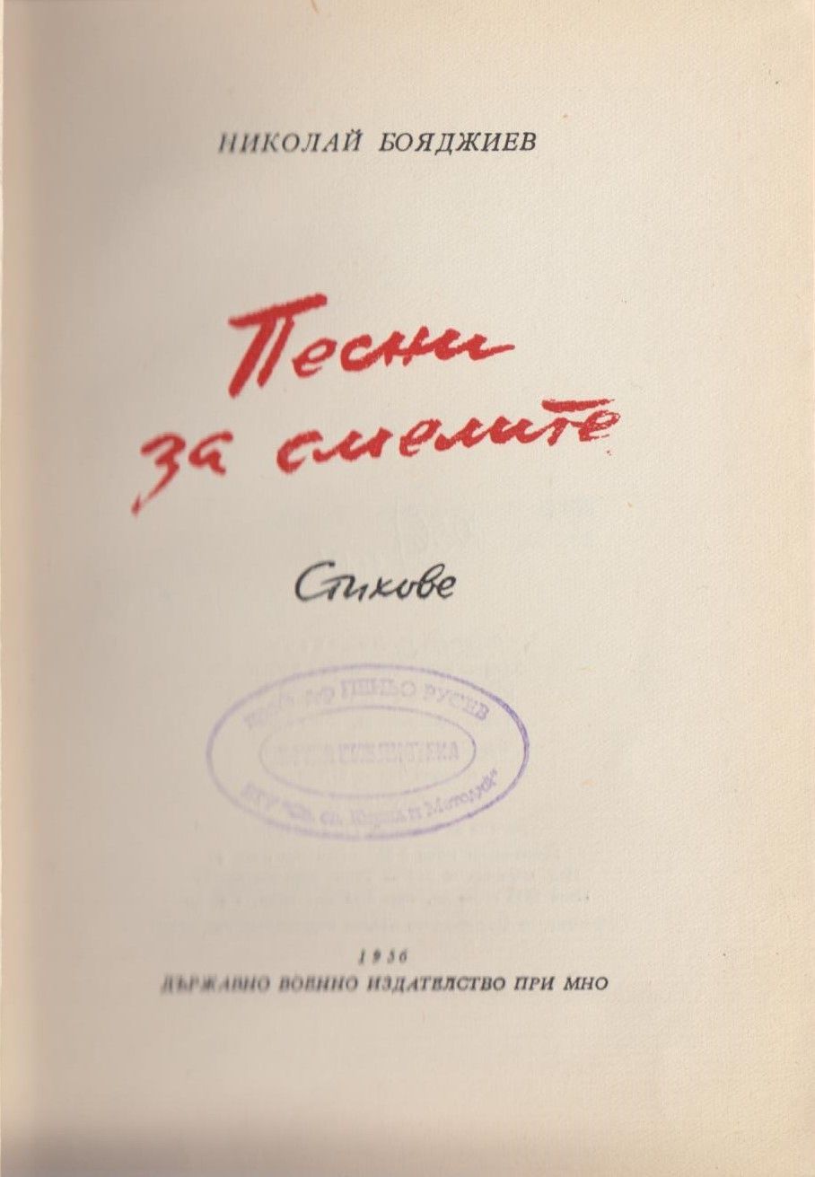Бояджиев, Николай. Песни за смелите : [Стихотворения] / Николай Бояджиев. - София : Държавно военно издателство, 1956. - 64 с. ; 18 см.