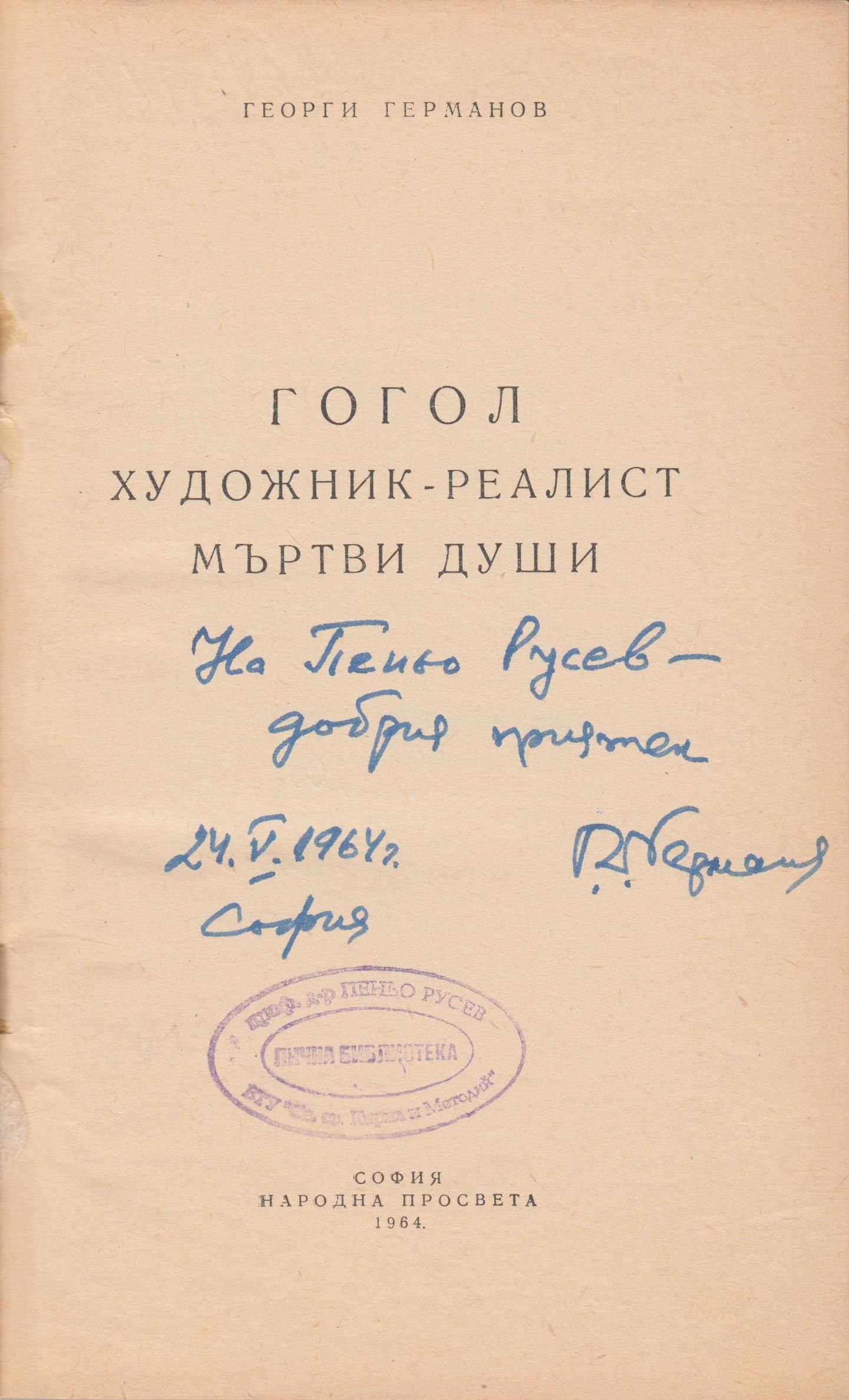 Германов, Георги. Гогол - художник-реалист. Мъртви души. / Георги Д. Германов. - София : Нар. просв., 1964. - 120 с. ; 24 см.