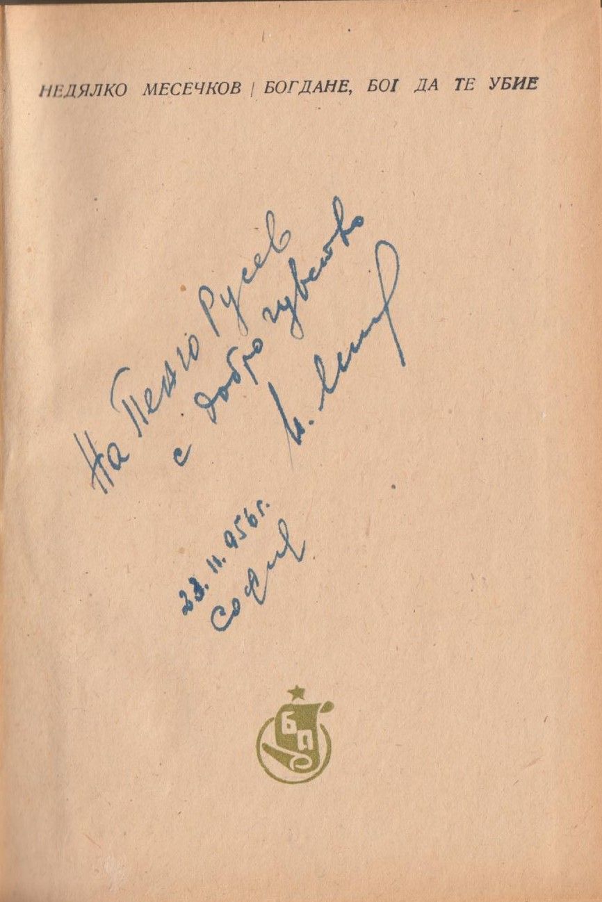 Месечков, Недялко. Богдане, бог да те убие : Разкази / Недялко Месечков. - [София] : Бълг. писател, [1953]. - 112 с. ; 18 см.