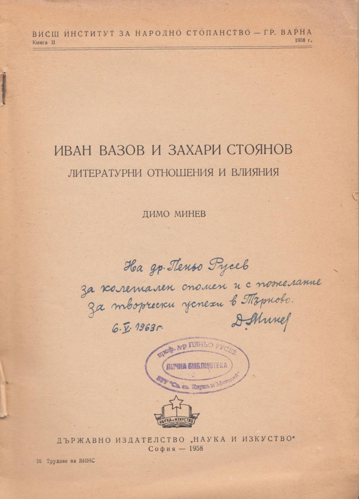 Описание : Автограф на бълг. език: На др. Пеньо Русев за колегиален спомен и с пожелание за творчески успехи в Търново, 06.05.1963 г.