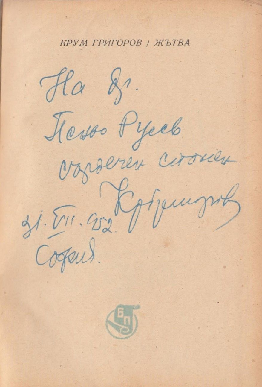 Описание : Автограф на бълг. език: На др. Пеньо Русев сърдечен спомен, 21.07.952