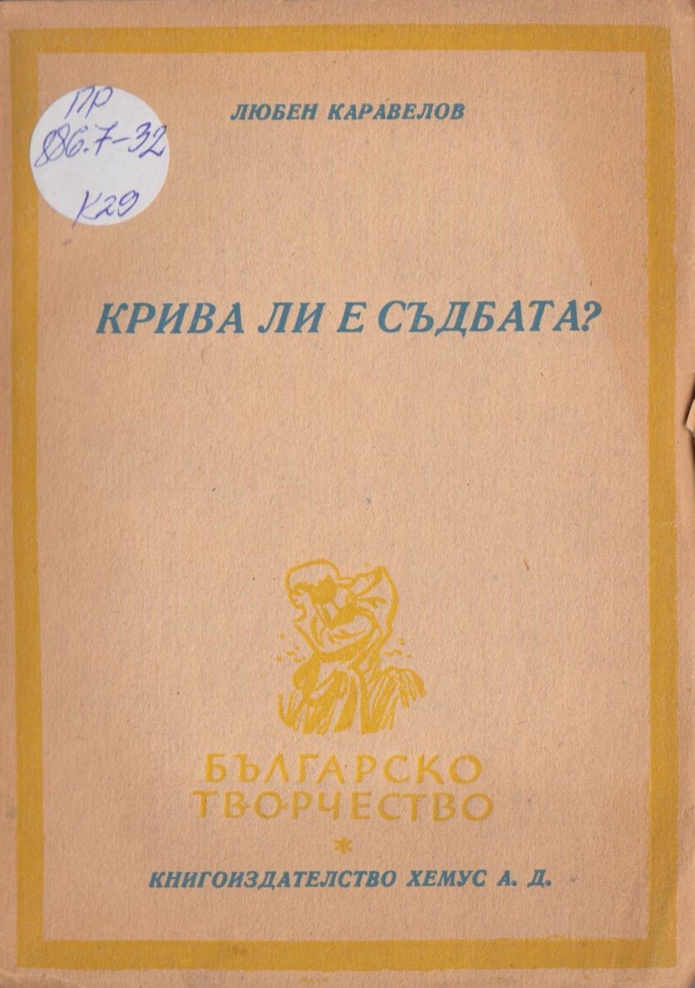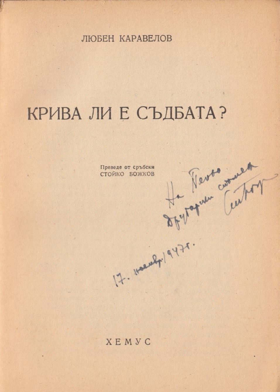 Каравелов, Любен. Крива ли е съдбата? / Любен Каравелов ; Прев. от сръб. Стойко Божков. - [София] : Хемус, [1946]. - 139 с. ; 25 см.