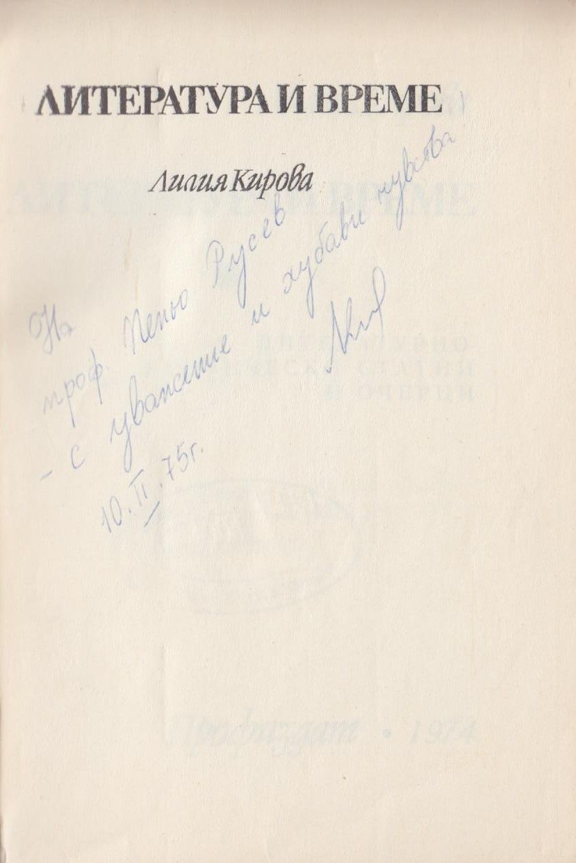 Кирова, Лилия Цветанова. Литература и време : Литературно-критически статии и очерци / Лилия Кирова. - София : Профиздат, 1974. - 215 с. ; 17 см.