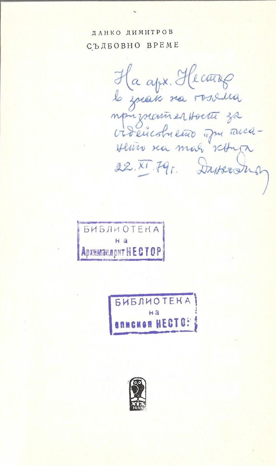 Димитров, Данко Н. Съдбовно време : Роман / Данко Н. Димитров. - Пловдив : Хр. Г. Данов, 1979. - 191 с. ; 21 см.
