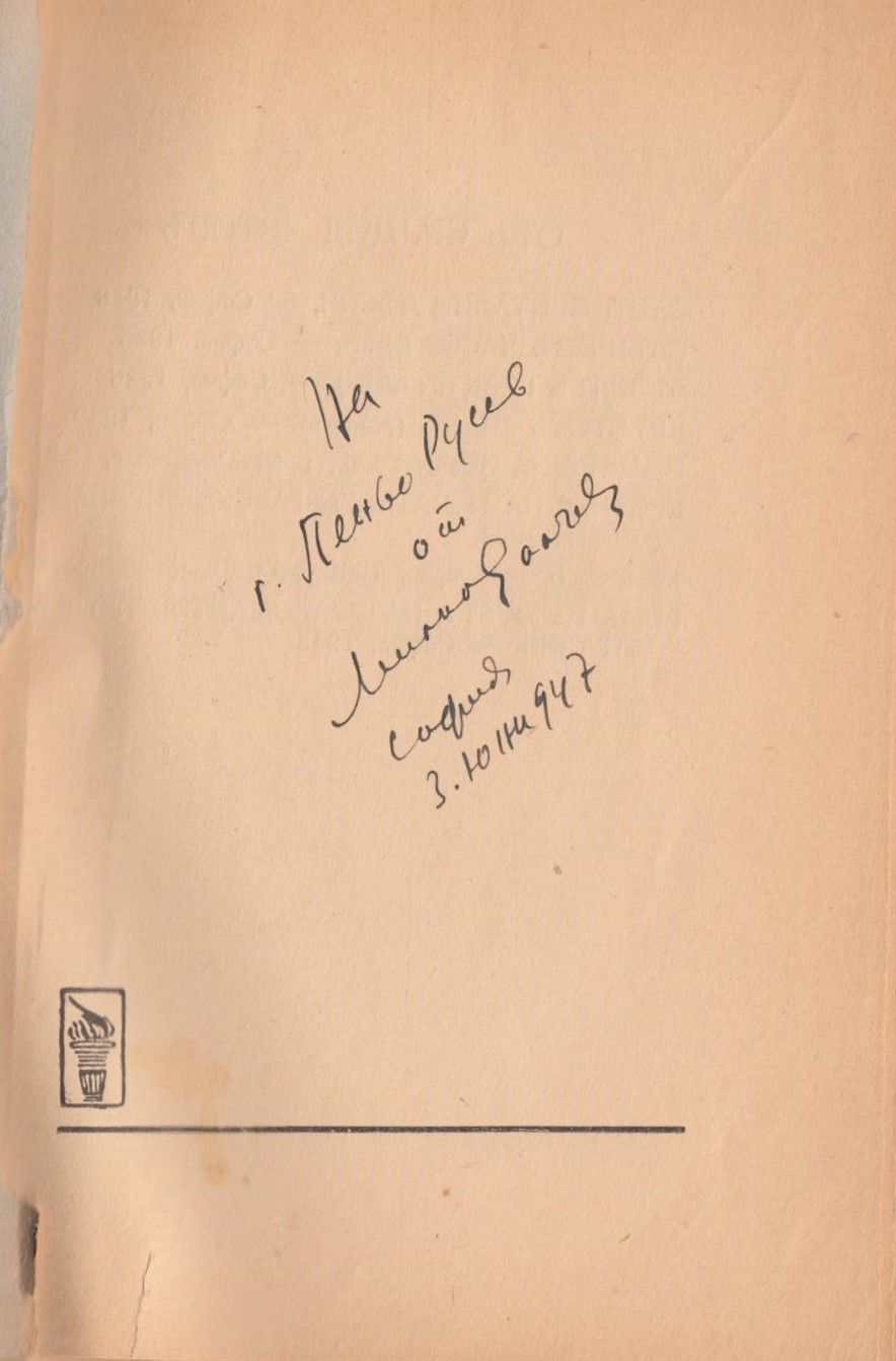 Описание : Автограф на бълг. език: На г. Пеньо Русев от Милко Ралчев, София, 3 юни [1]947