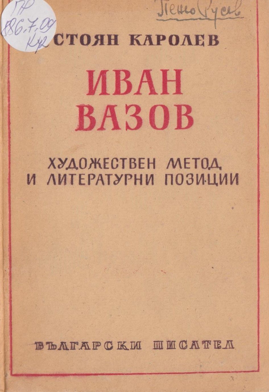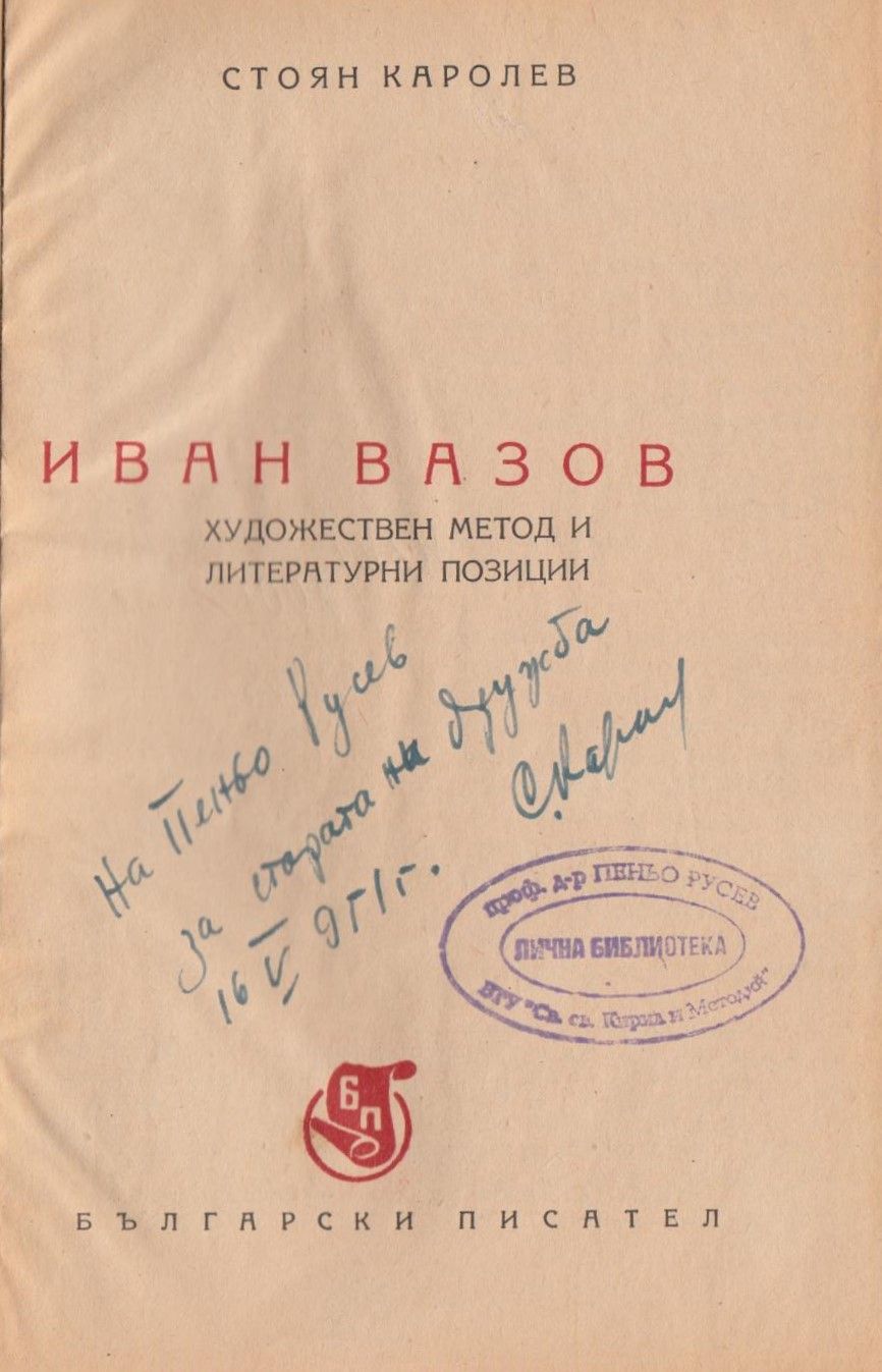 Каролев, Стоян. Иван Вазов : Художествен метод и литературна позиции / Стоян Каролев. - София : Бълг. писател, 1951. - 150 с. ; 18 см.