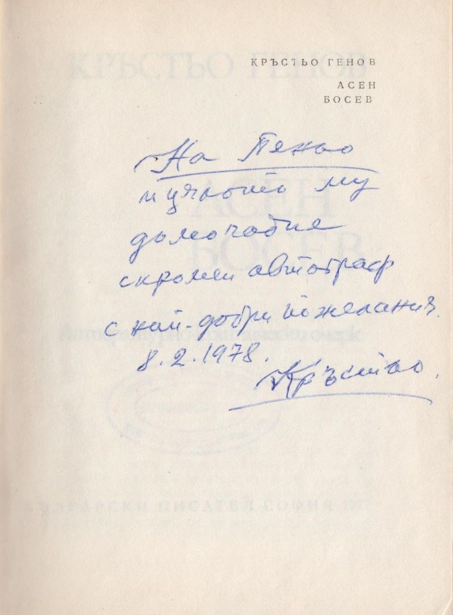 Описание : Автограф на бълг. език: На Пеньо и цялото му домочадие скромен автограф с най-добри пожелания, 8.2.1978 г.