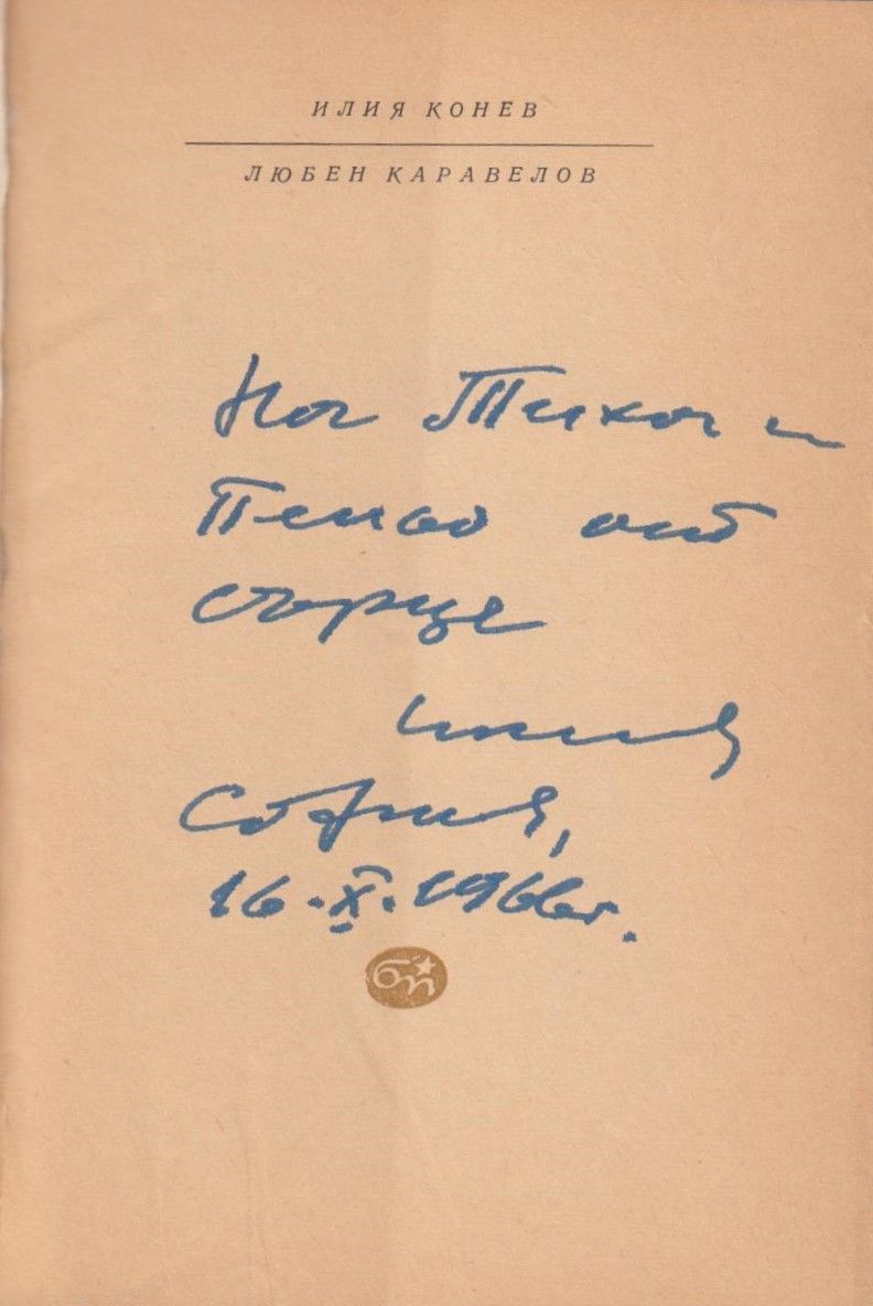 Описание : Автограф на бълг. език: На Тиха и Пеньо от сърце, София, 16.10.1966 г.