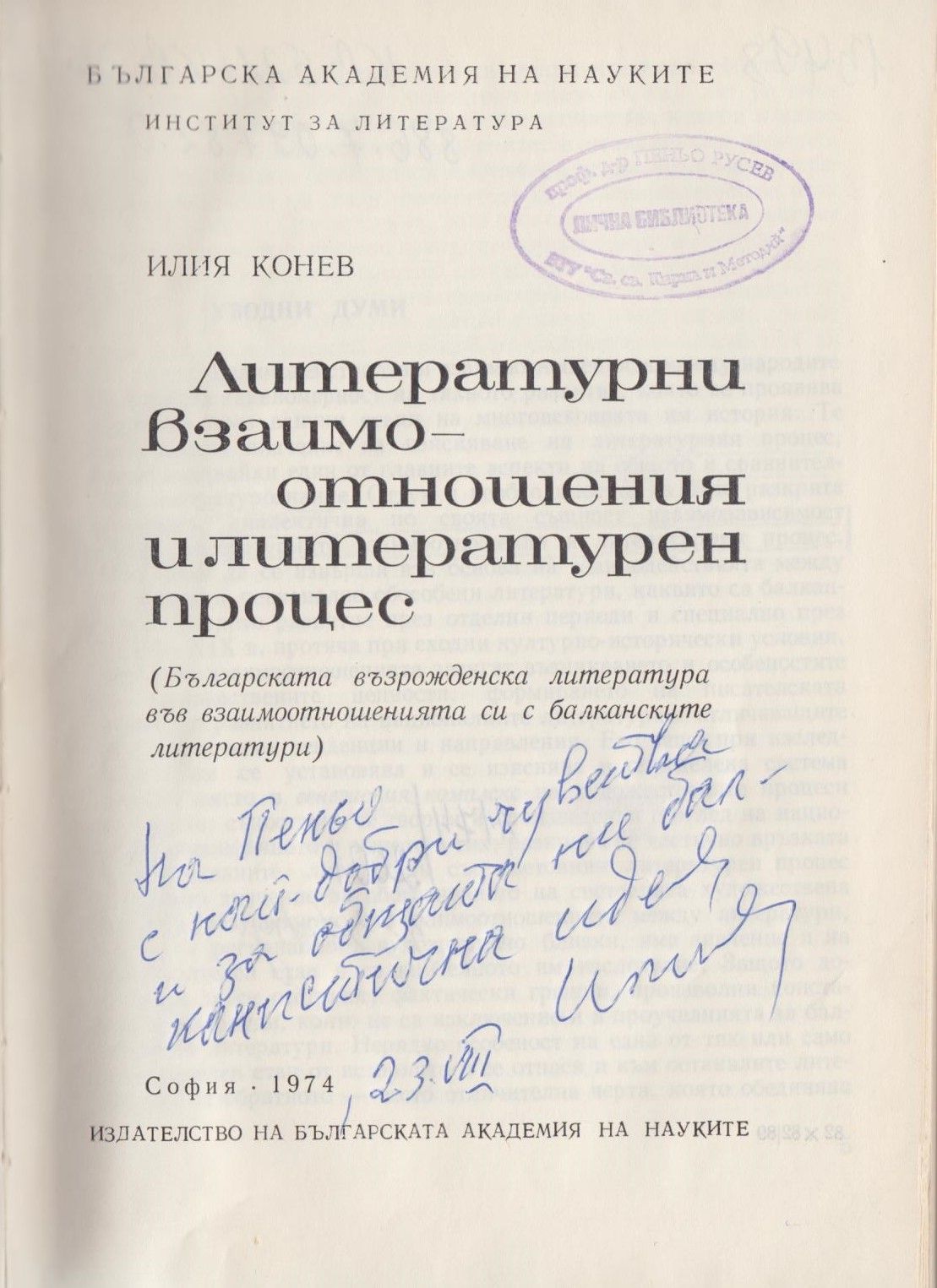 Описание : Автограф на бълг. език: На Пеньо, с най-добри чувства и за общата ни балканистична идея, 23.07.1974