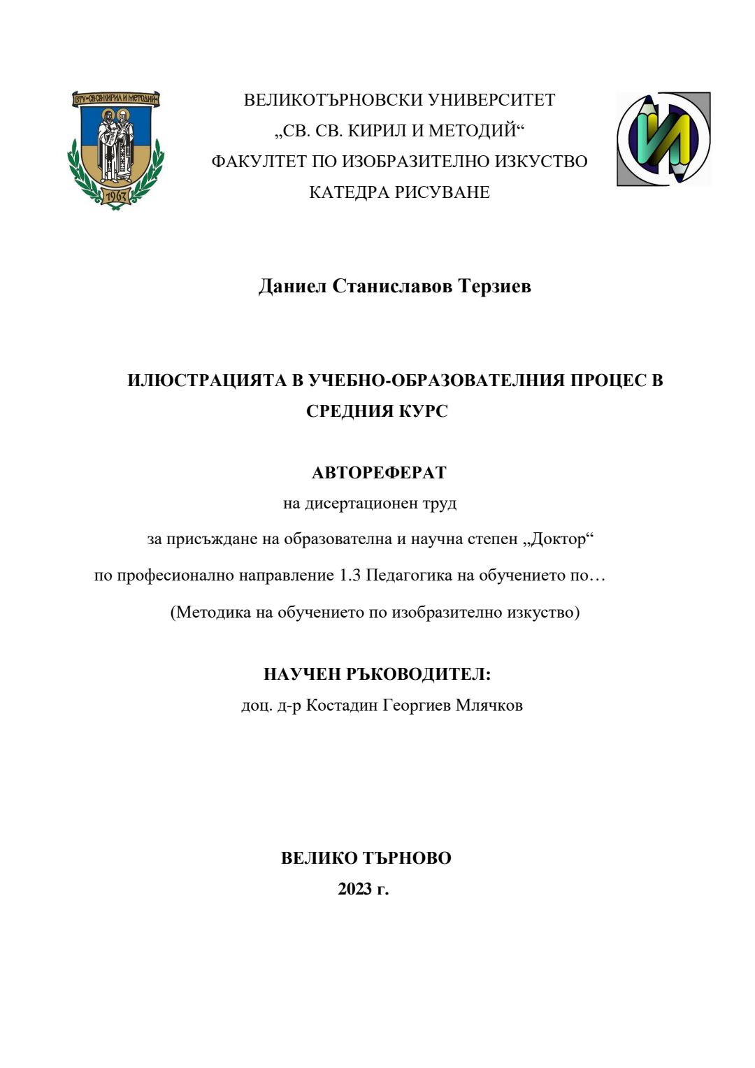 Илюстрацията в учебно-образователния процес в средния курс : Автореферат / Даниел Станиславов Терзиев ; Науч. ръководител Костадин Млячков