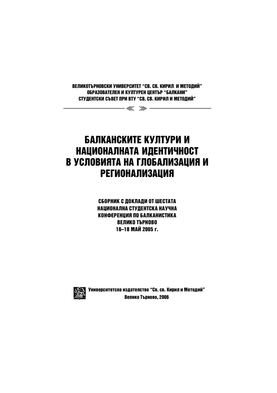 Балканските култури и националната идентичност в условията на глобализация и регионализация : Сб. с докл. от шестата нац. студентска науч. конф. по балканистика, Велико Търново, 16-18 май 2005 г.