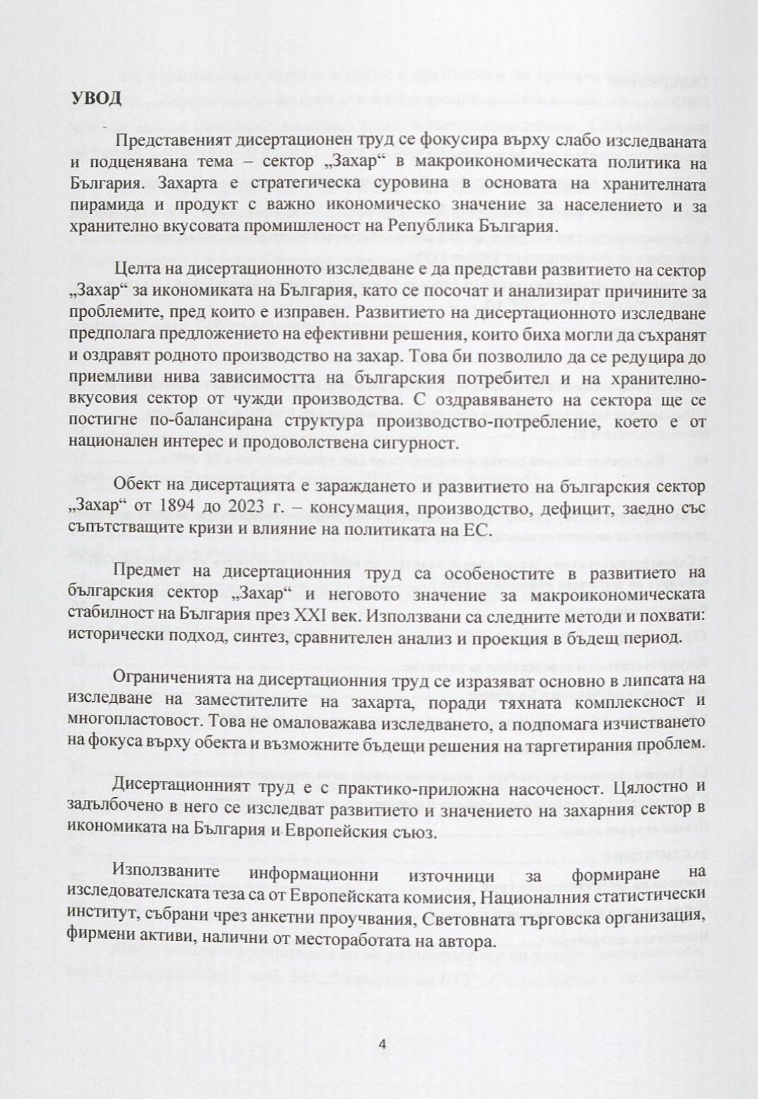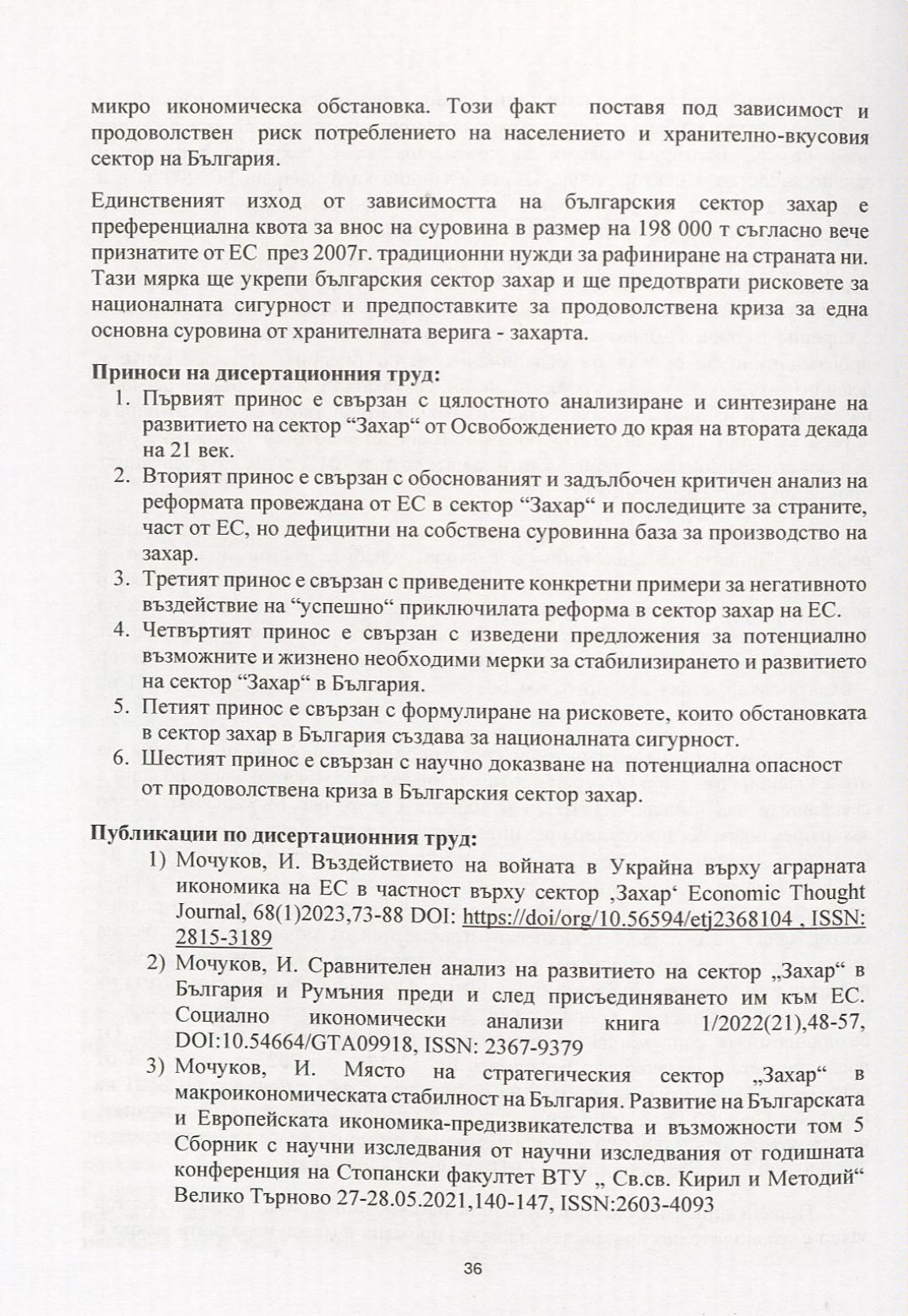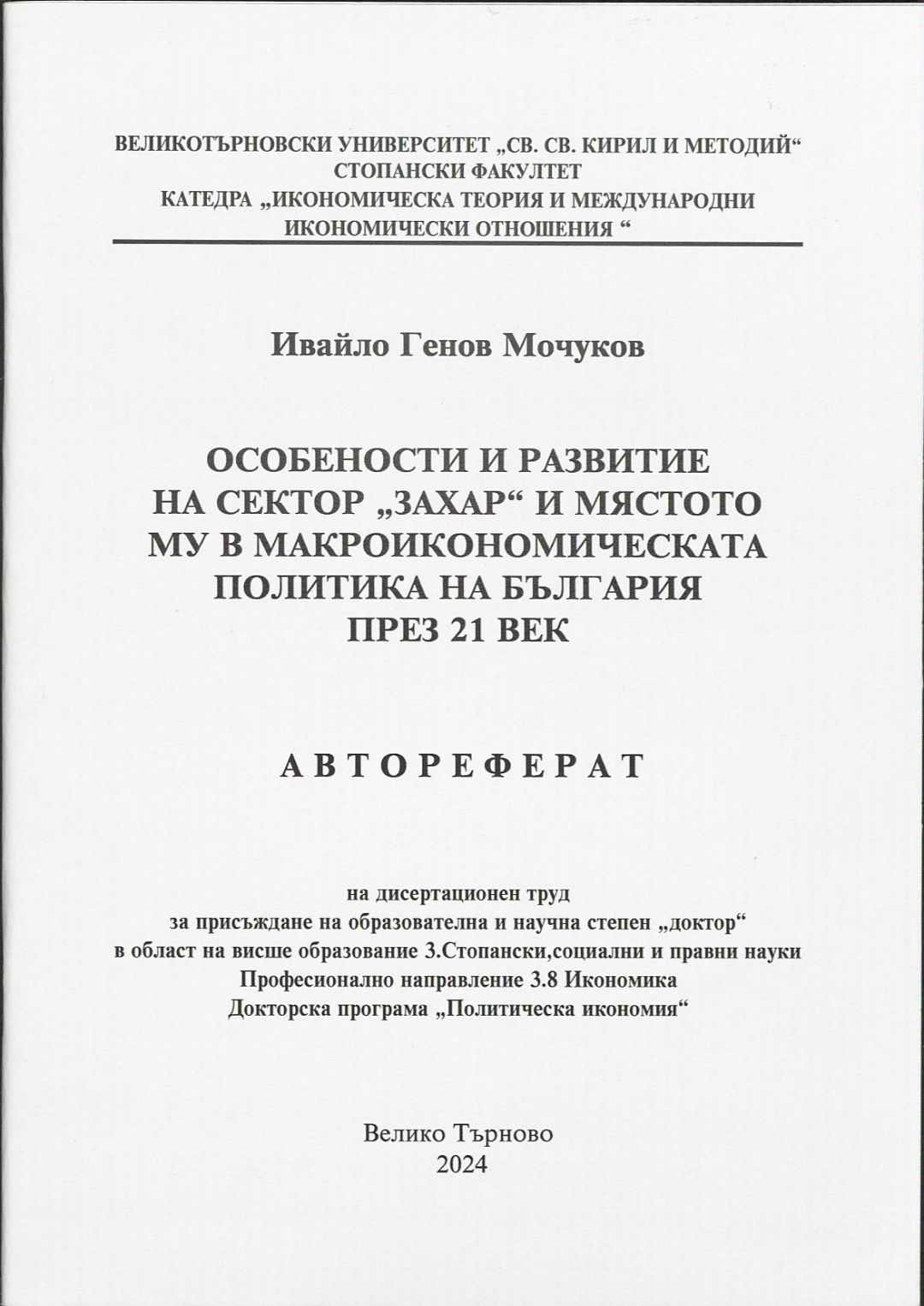 Особености и развитие на сектор "Захар" и мястото му в макроикономическата политика на България през 21 век : Автореферат / Ивайло Генов Мочуков ; Науч. ръководител Иван Руменов Бянов