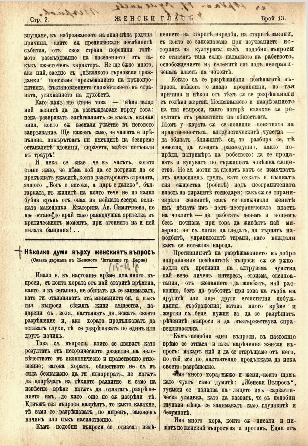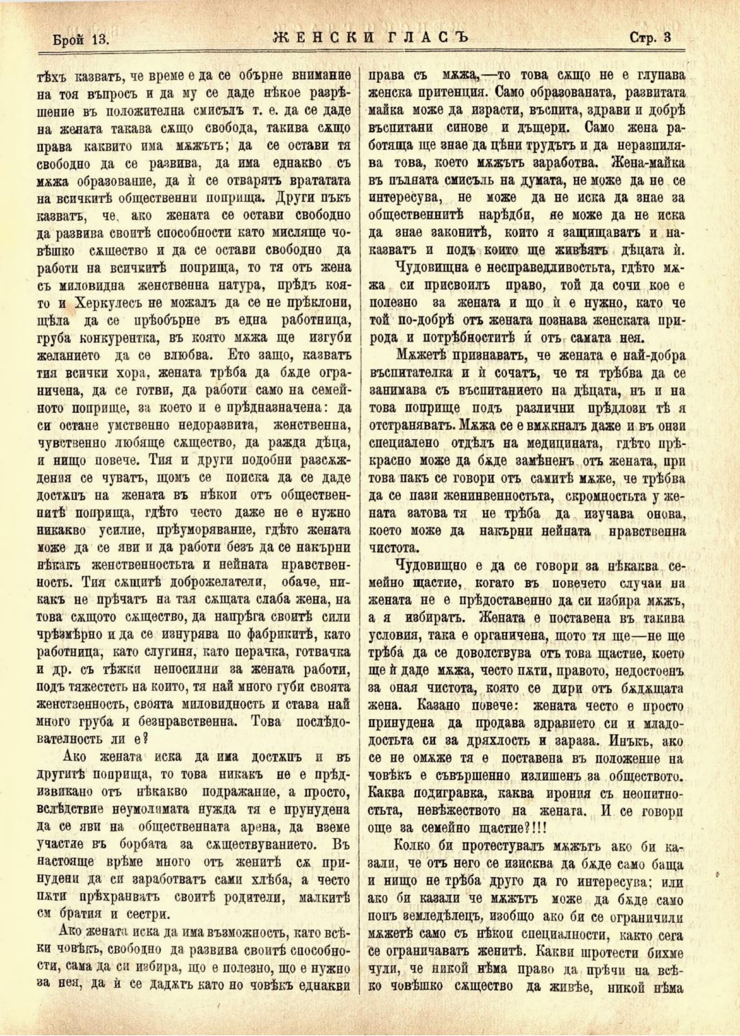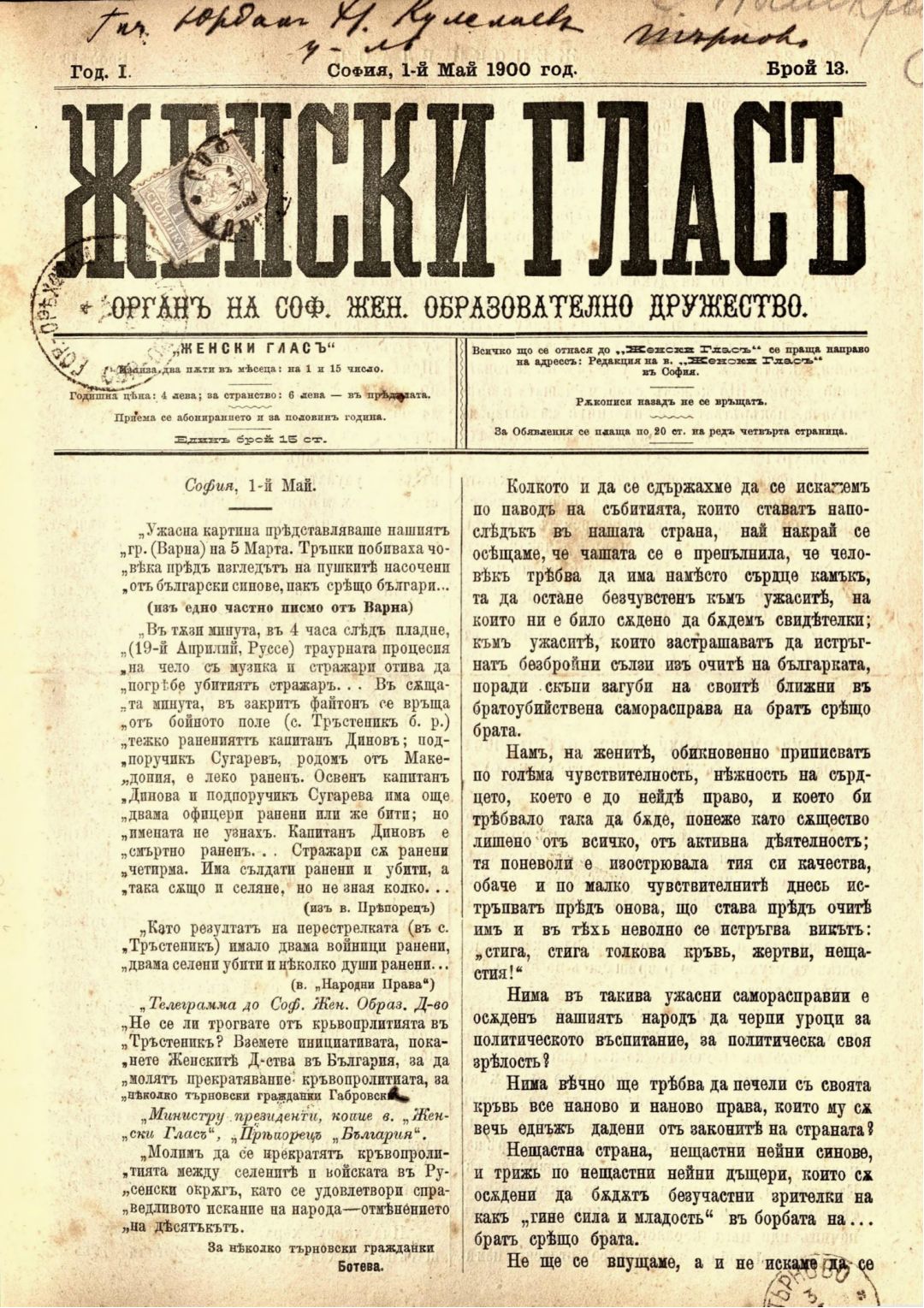 Год. 1,№ 13. Женски глас : Орган, посветен на интересите на жената