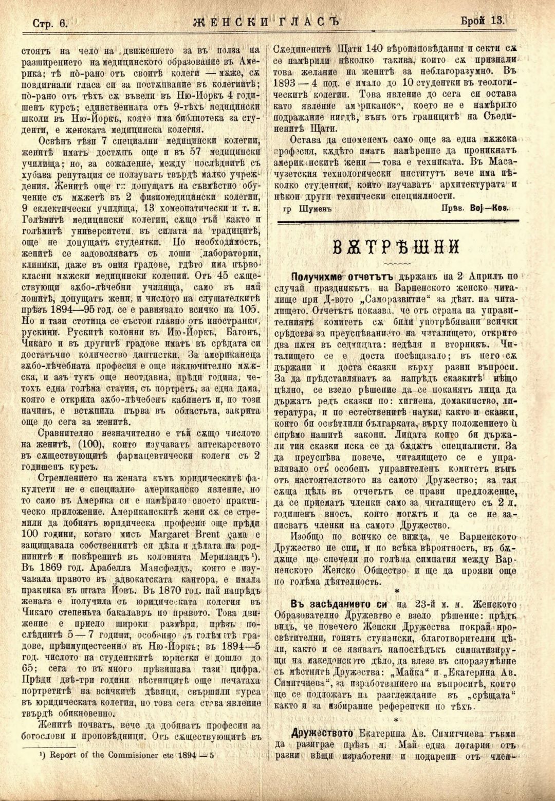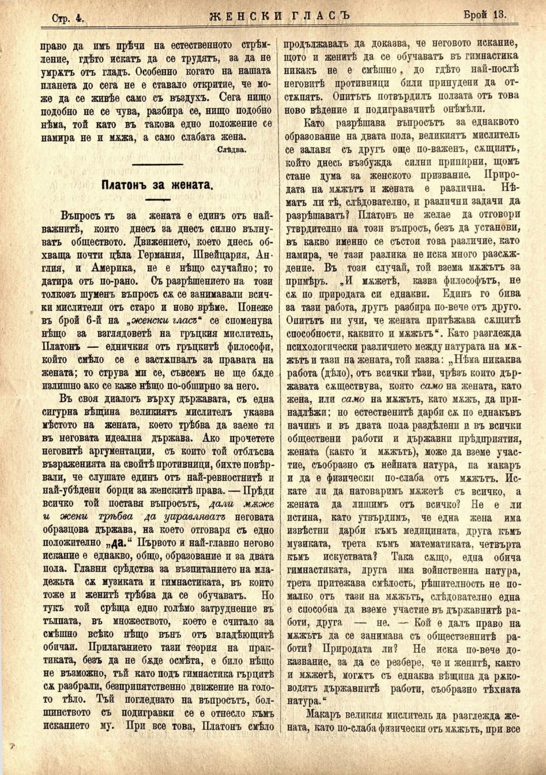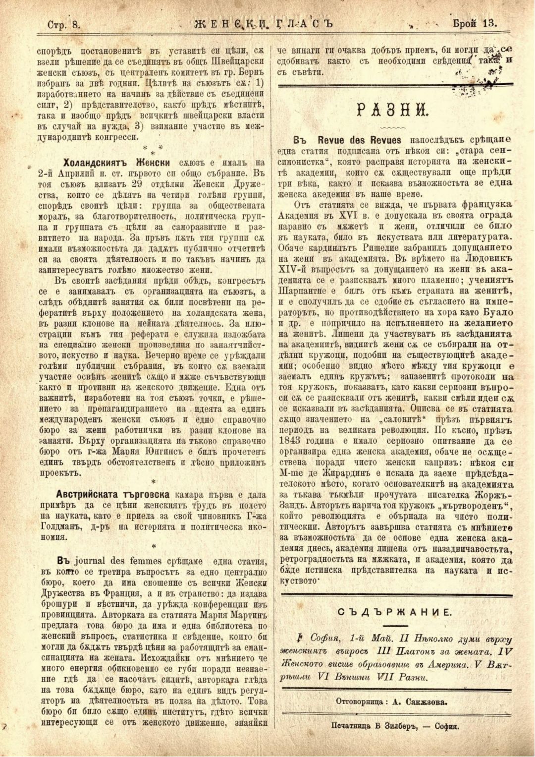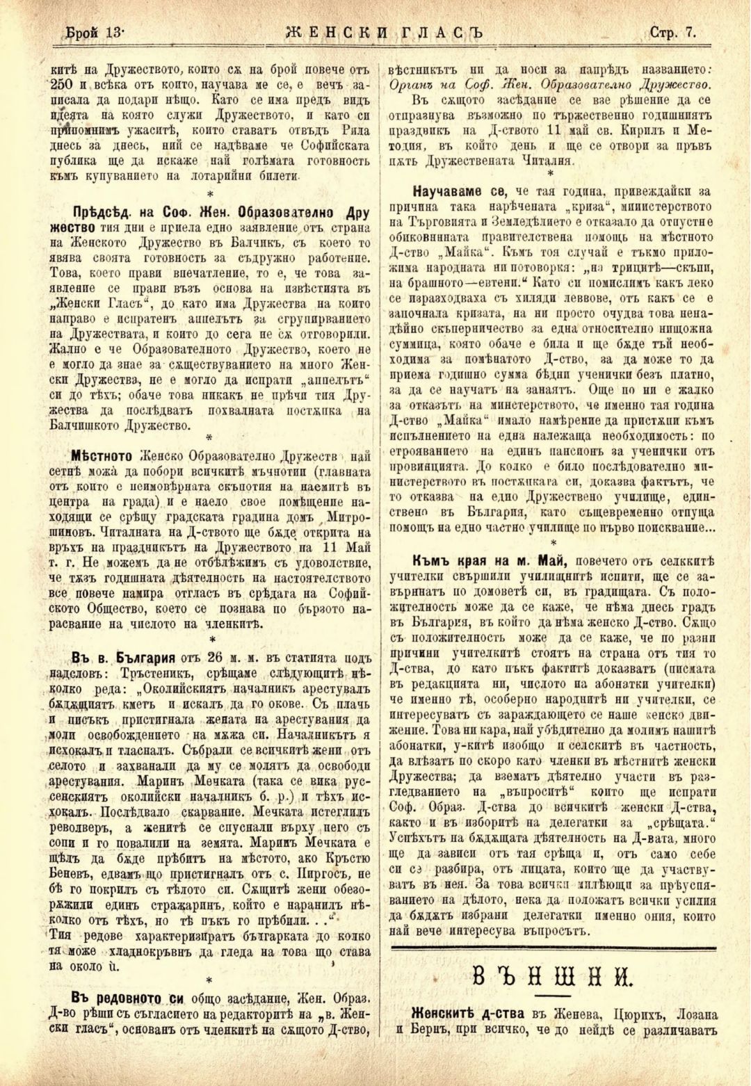 Год. 1,№ 13. Женски глас : Орган, посветен на интересите на жената