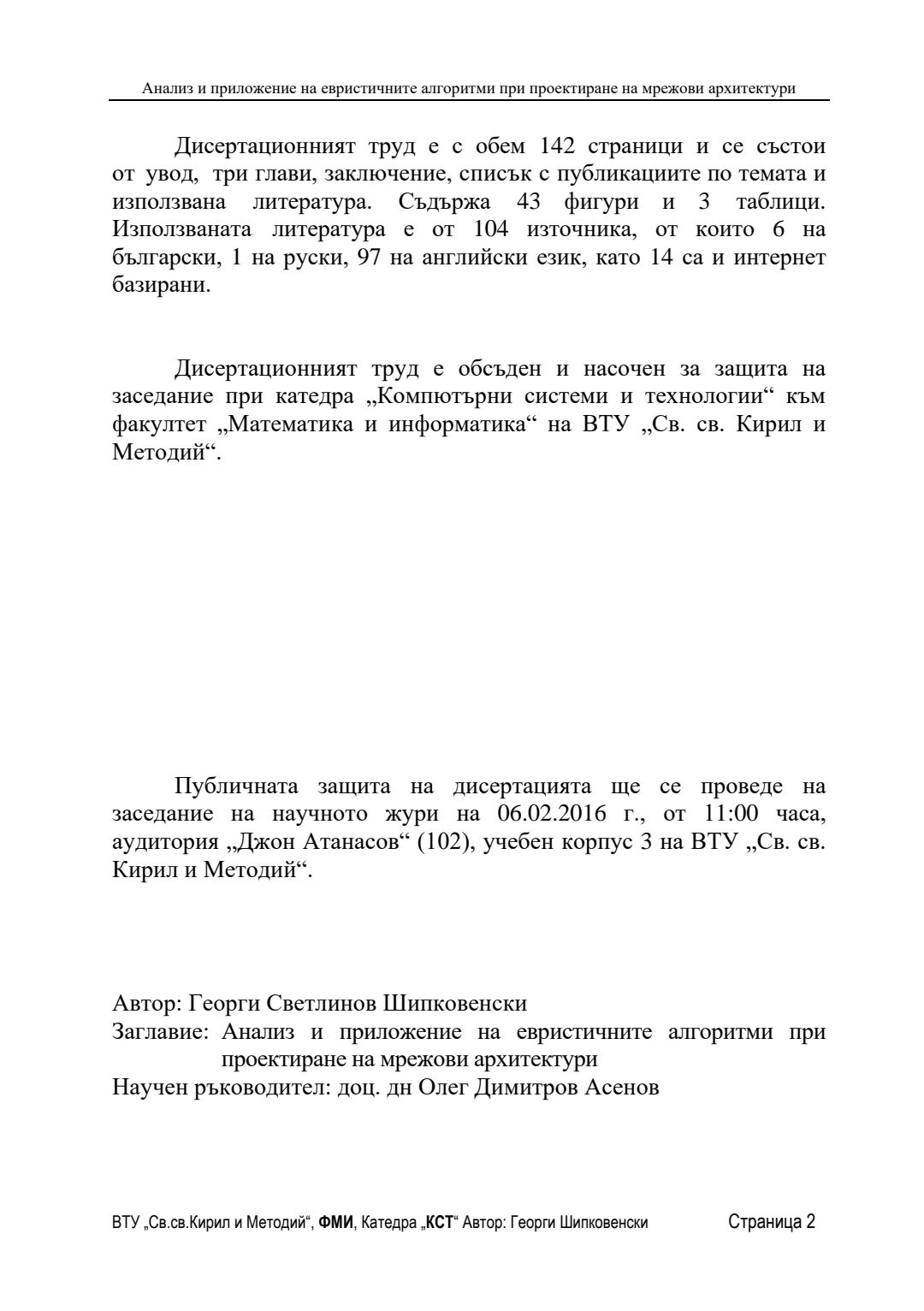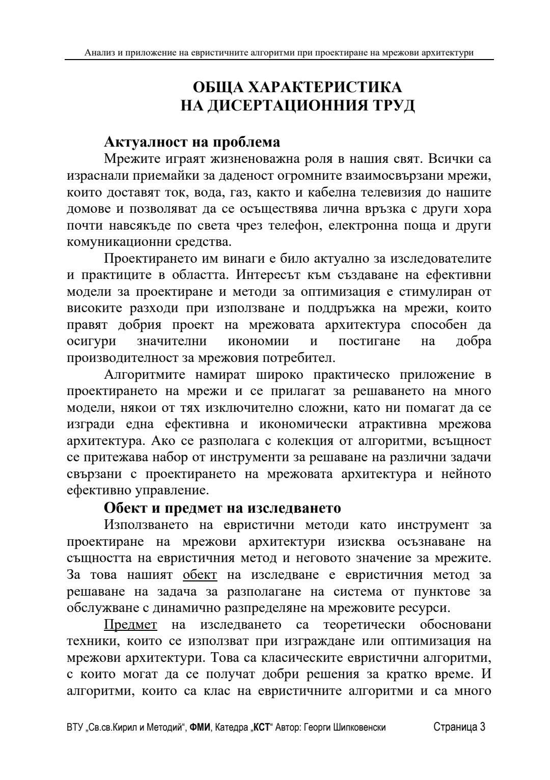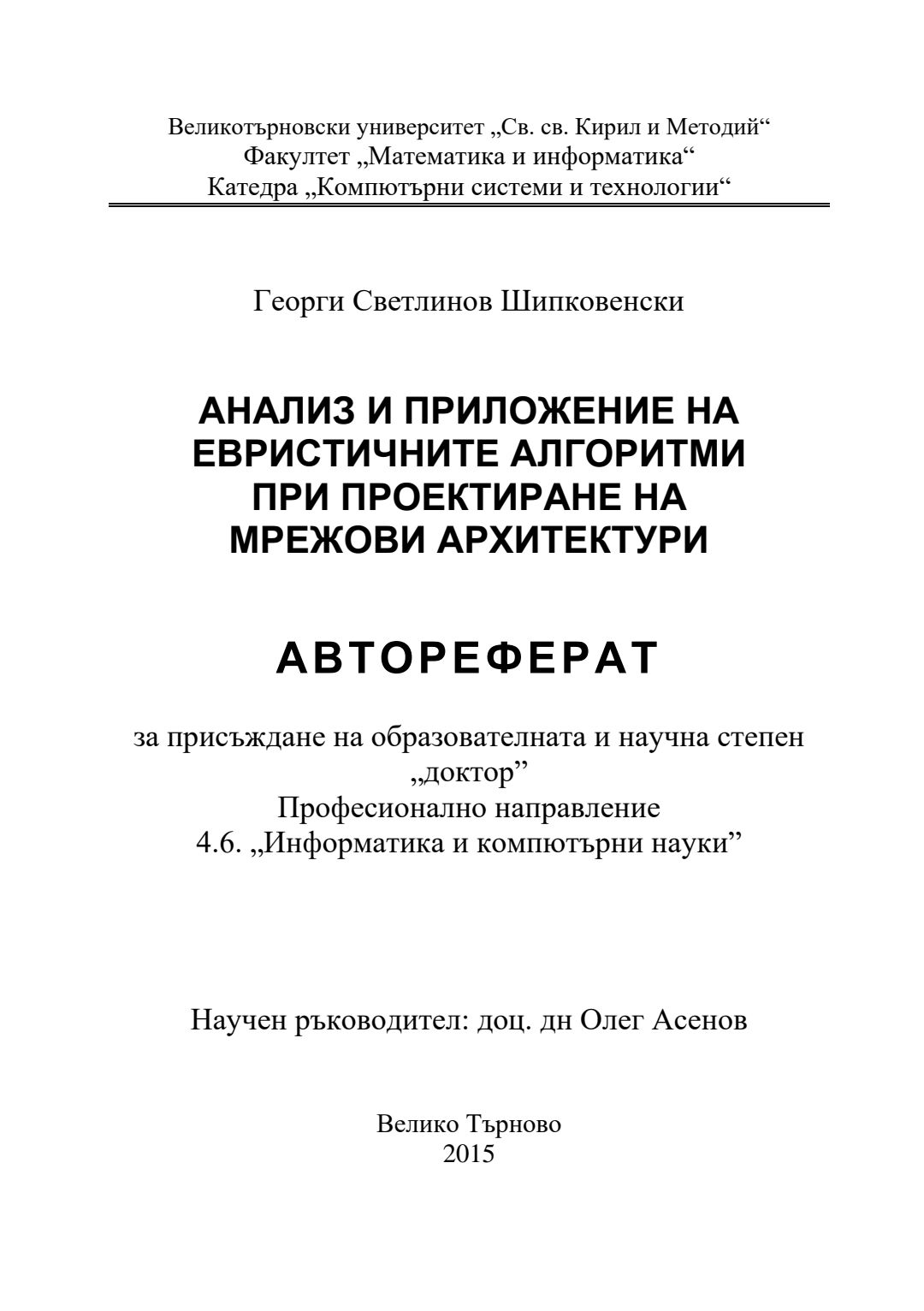 Анализ и приложение на евристичните алгоритми при проектиране на мрежови архитектури : Автореферат / Георги Шипковенски ; Науч. ръководител Олег Асенов