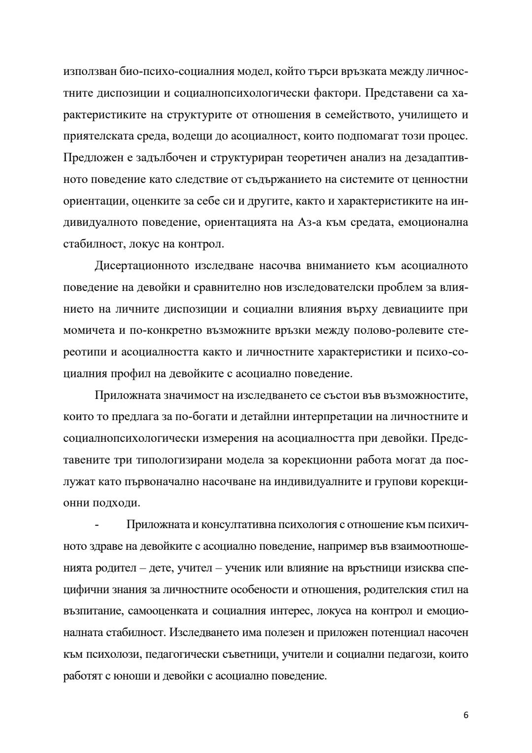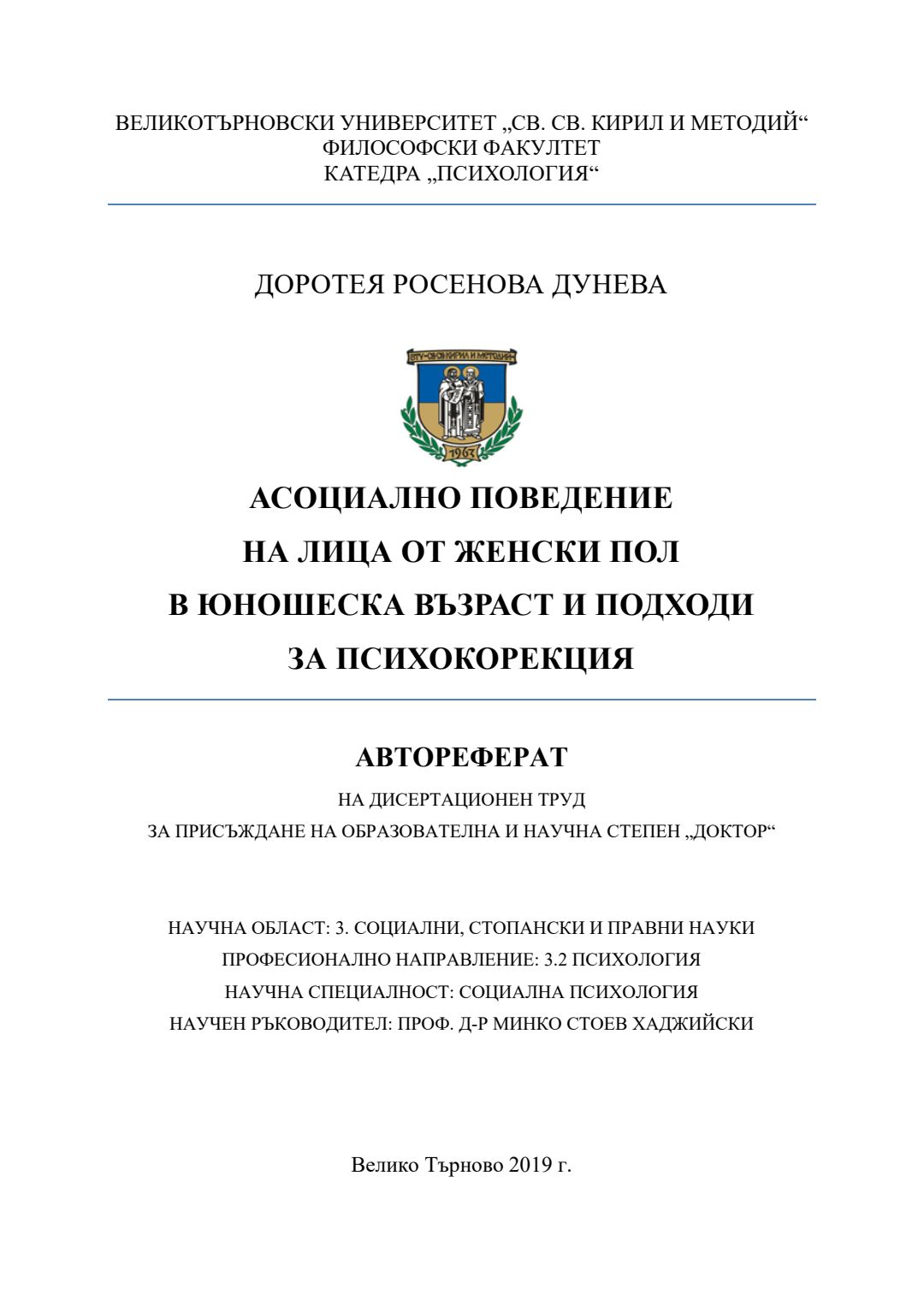 Асоциално поведение на лица от женски пол в юношеска възраст и подходи за психокорекция : Автореферат / Доротея Росенова Дунева ; Науч. ръководител Минко Стоев Хаджийски