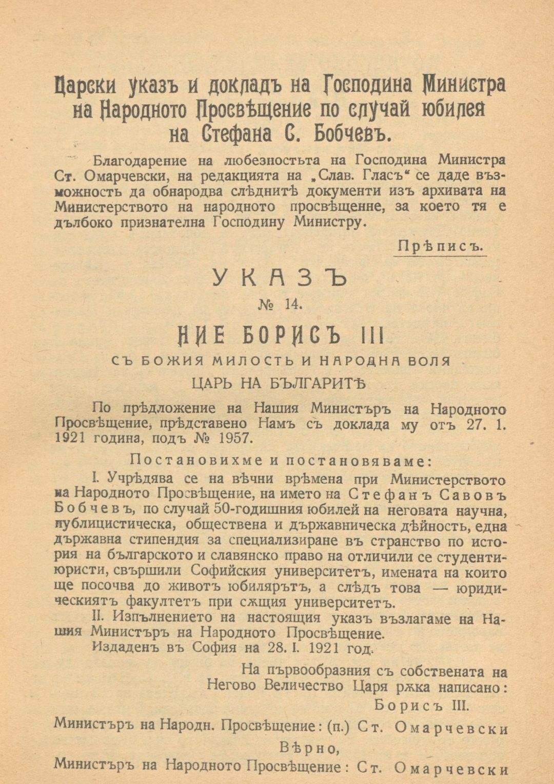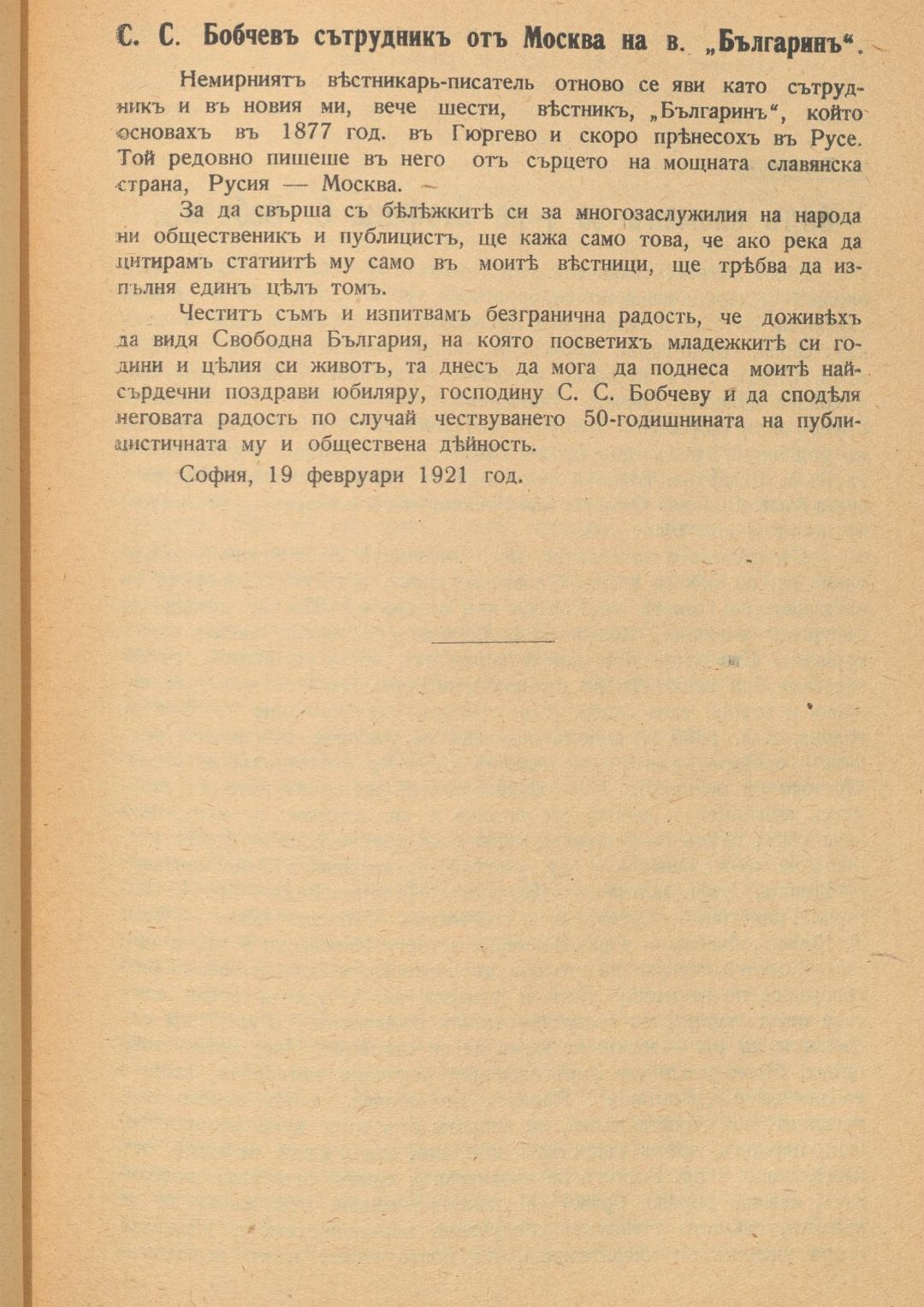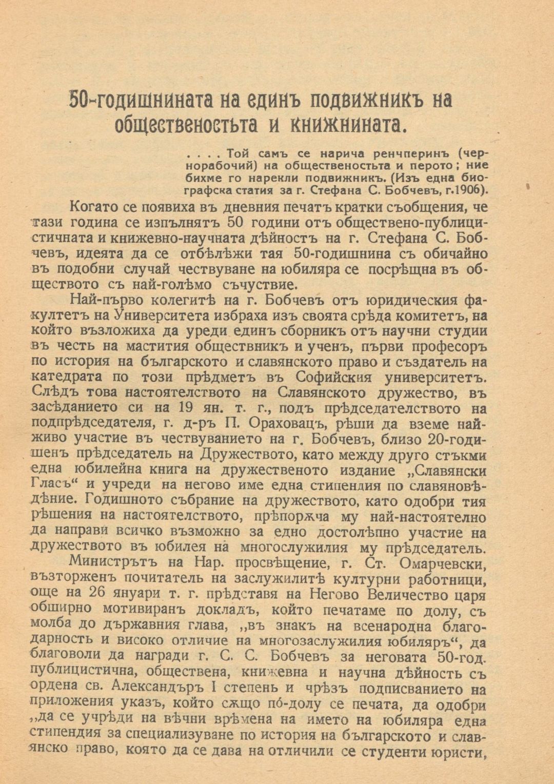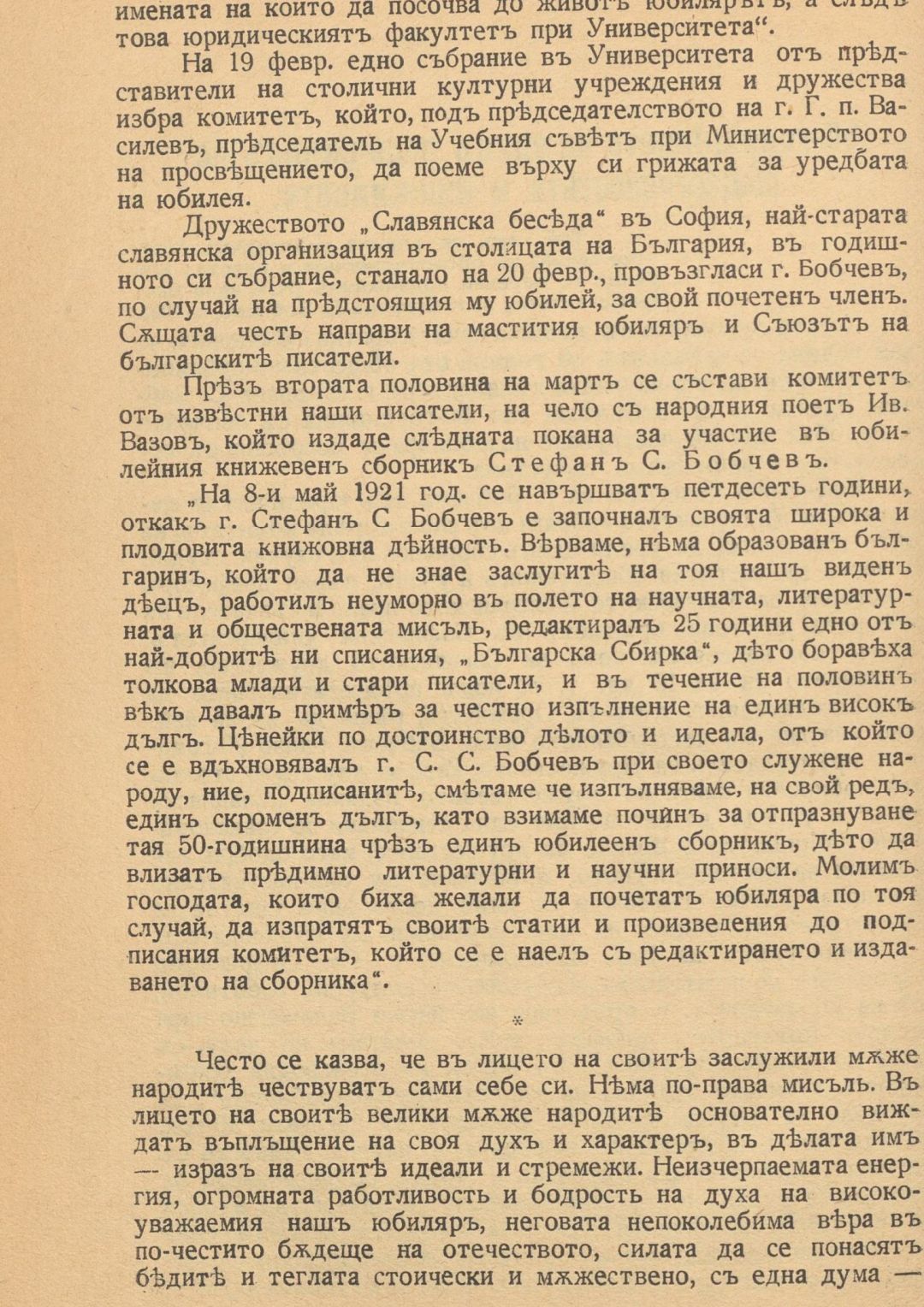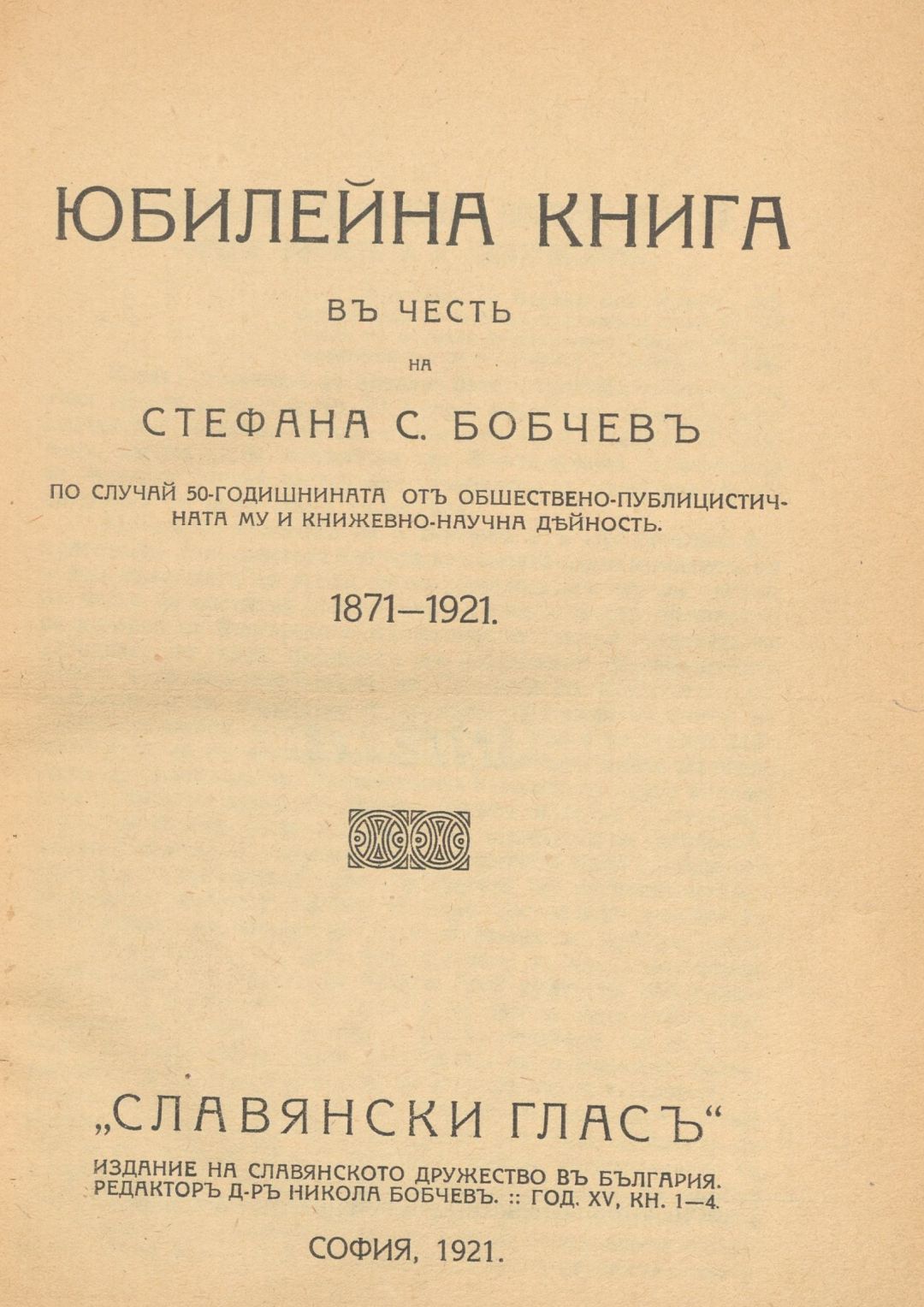 Юбилейна книга в чест на Стефана С. Бобчев по случай 50-годишнината от обществено-публицистичната му и книжовно-научна дейност : 1871-1921