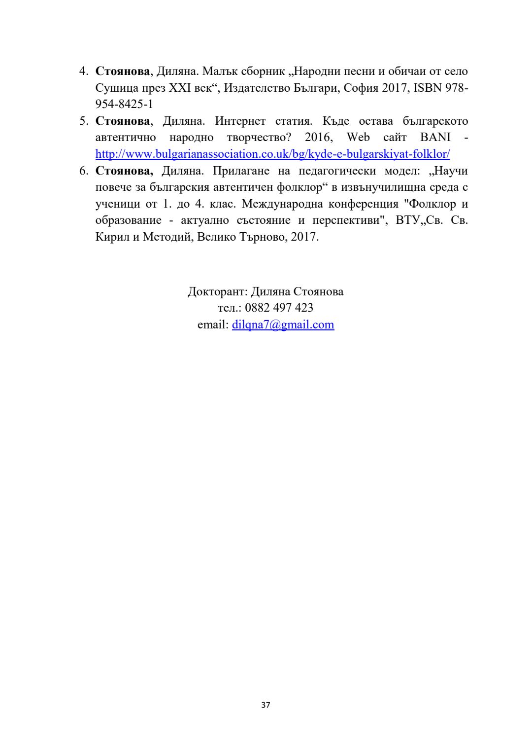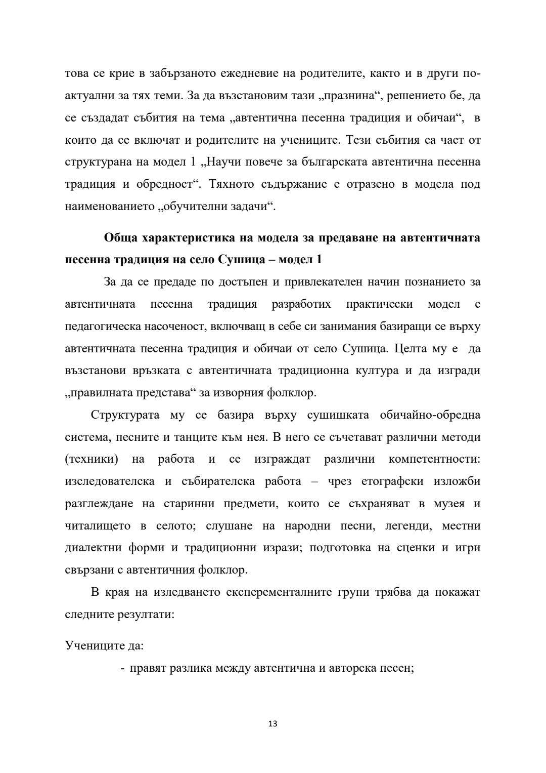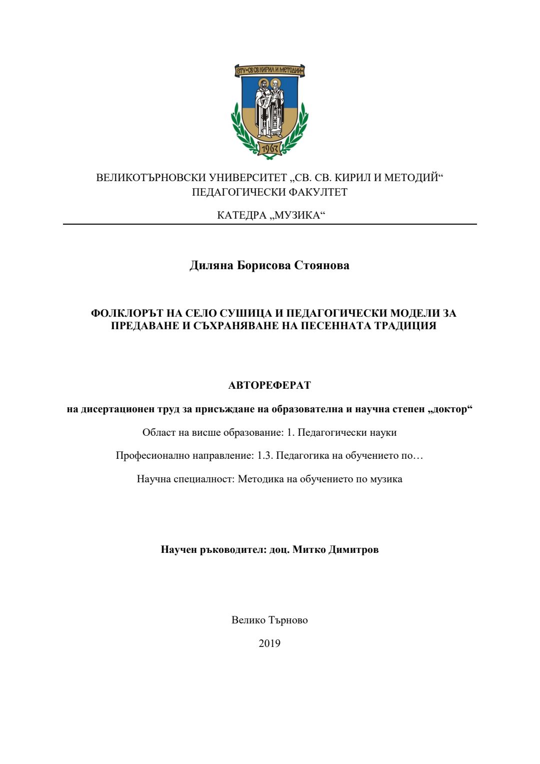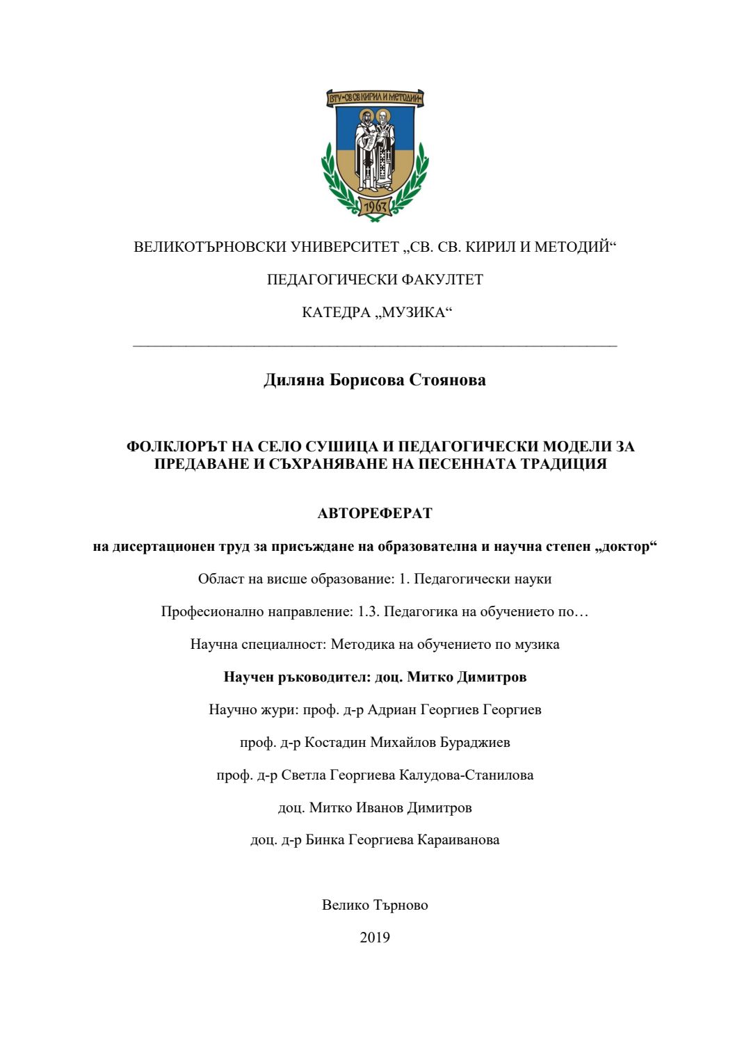Фолклорът на село Сушица и педагогически модели за предаване и съхраняване на песенната традиция : Автореферат / Диляна Борисова Стоянова ; Науч. ръководител Митко Димитров