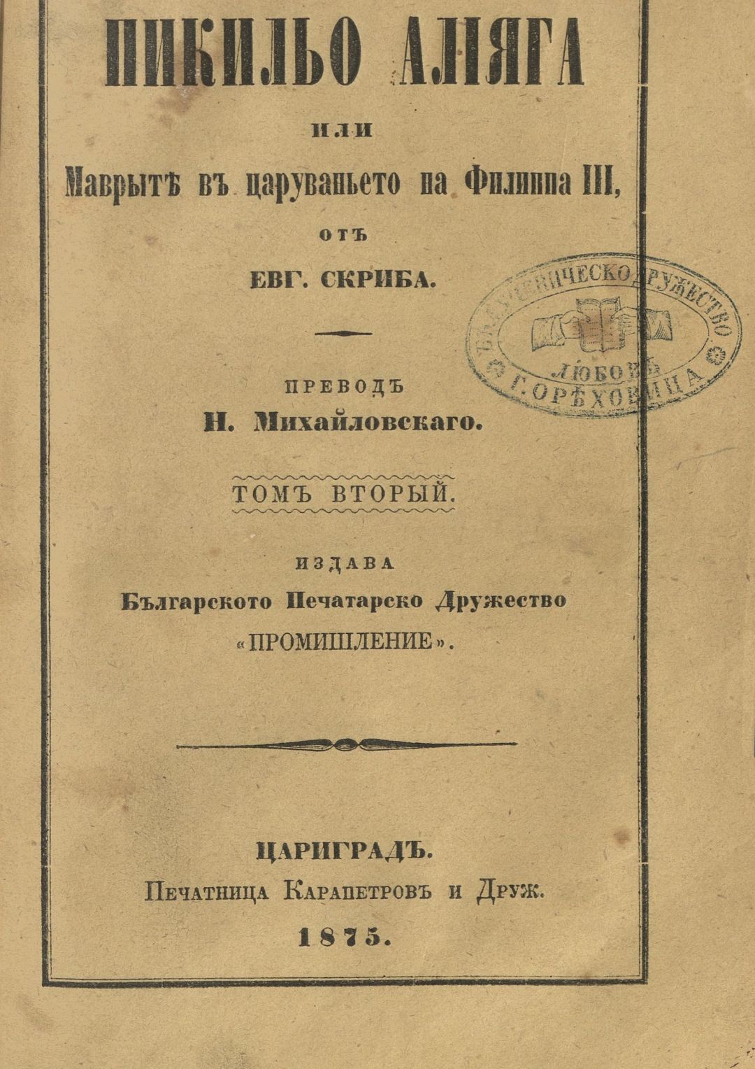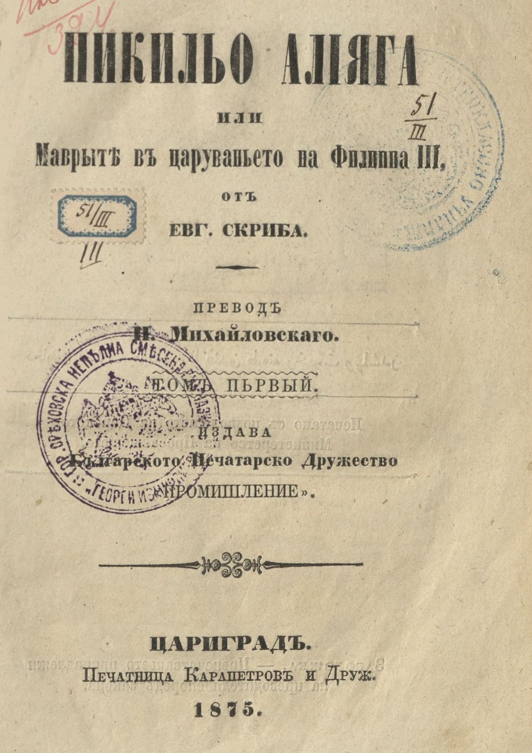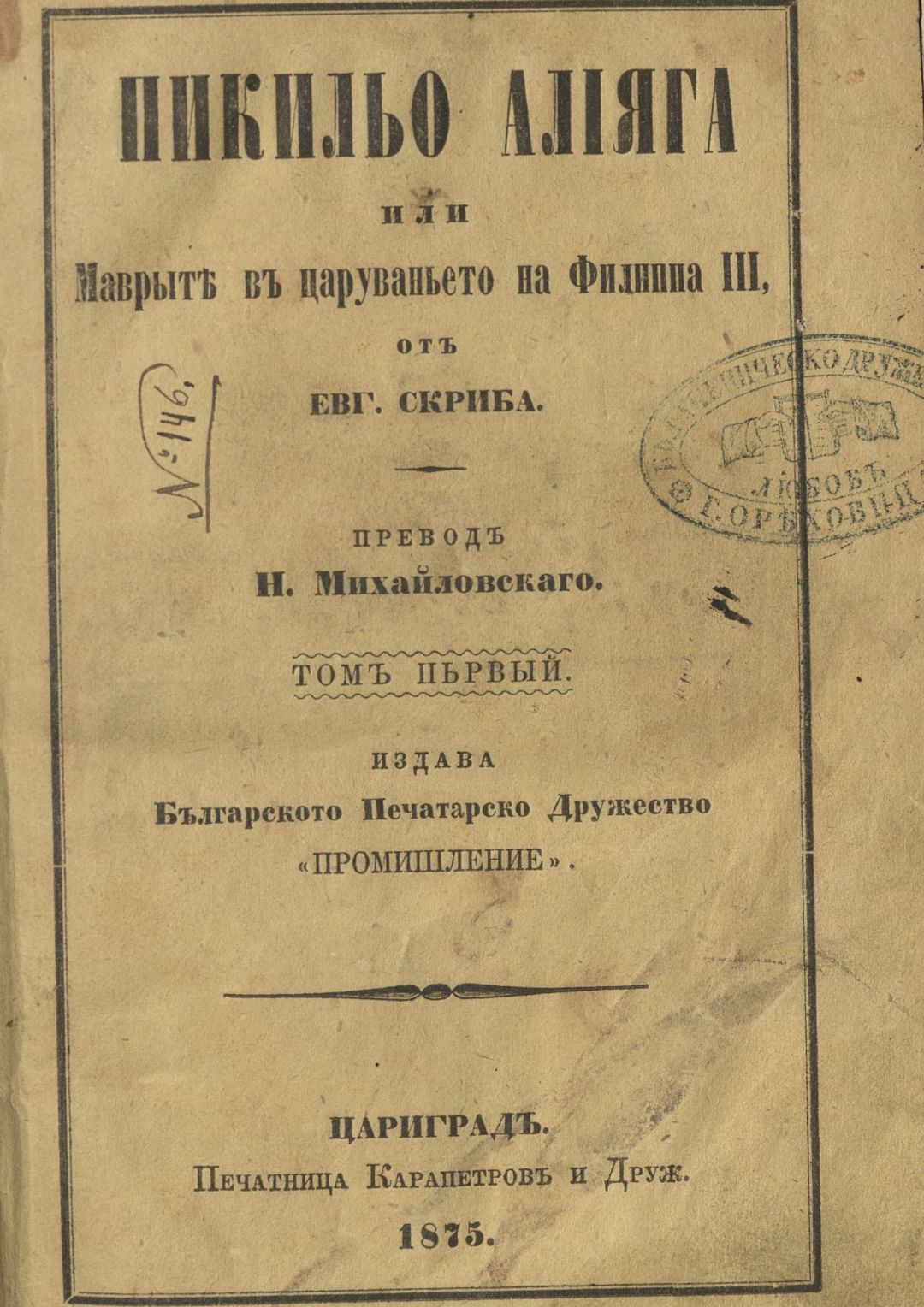 Пикильо Алияга или Маврите в царуването на Филипа III от Евг. Скриба. – Т. 1–2. [Роман] Т.1 - 2 . - 1875 . - Т.1- 160 с.; Т.2 - 152 с.