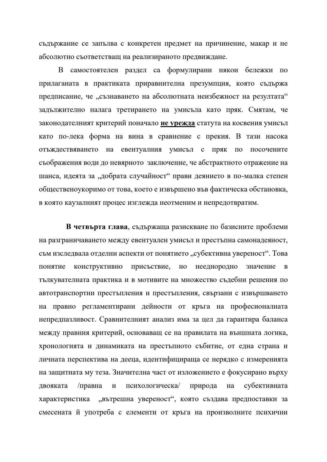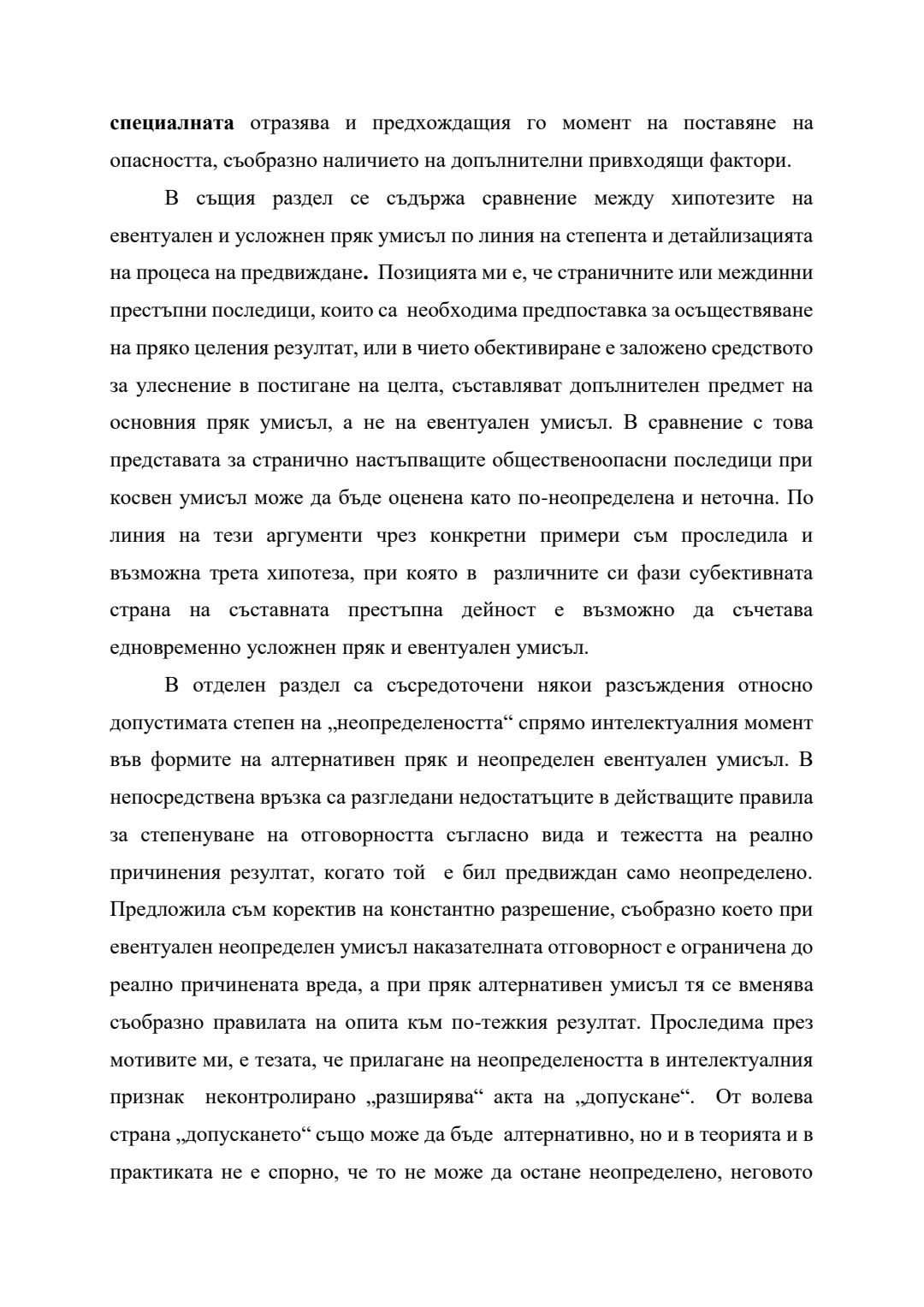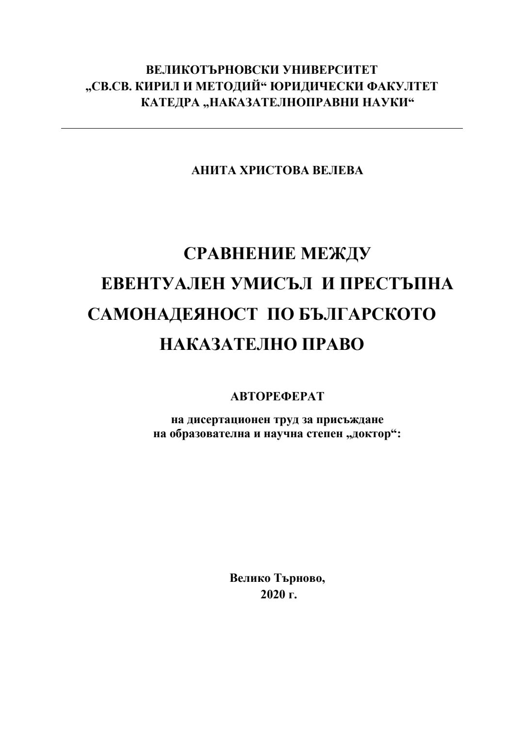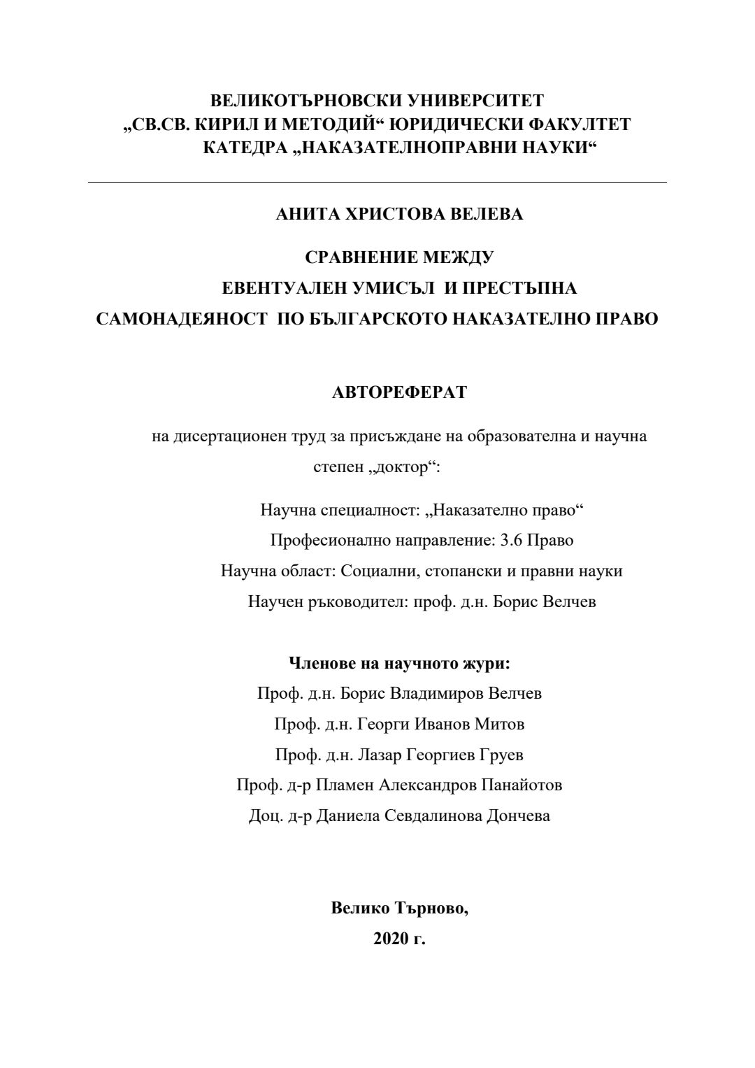 Сравнение между евентуален умисъл и престъпна самонадеяност по българското наказателно право : Автореферат / Анита Христова Велева ; Науч. ръководител Борис Велчев