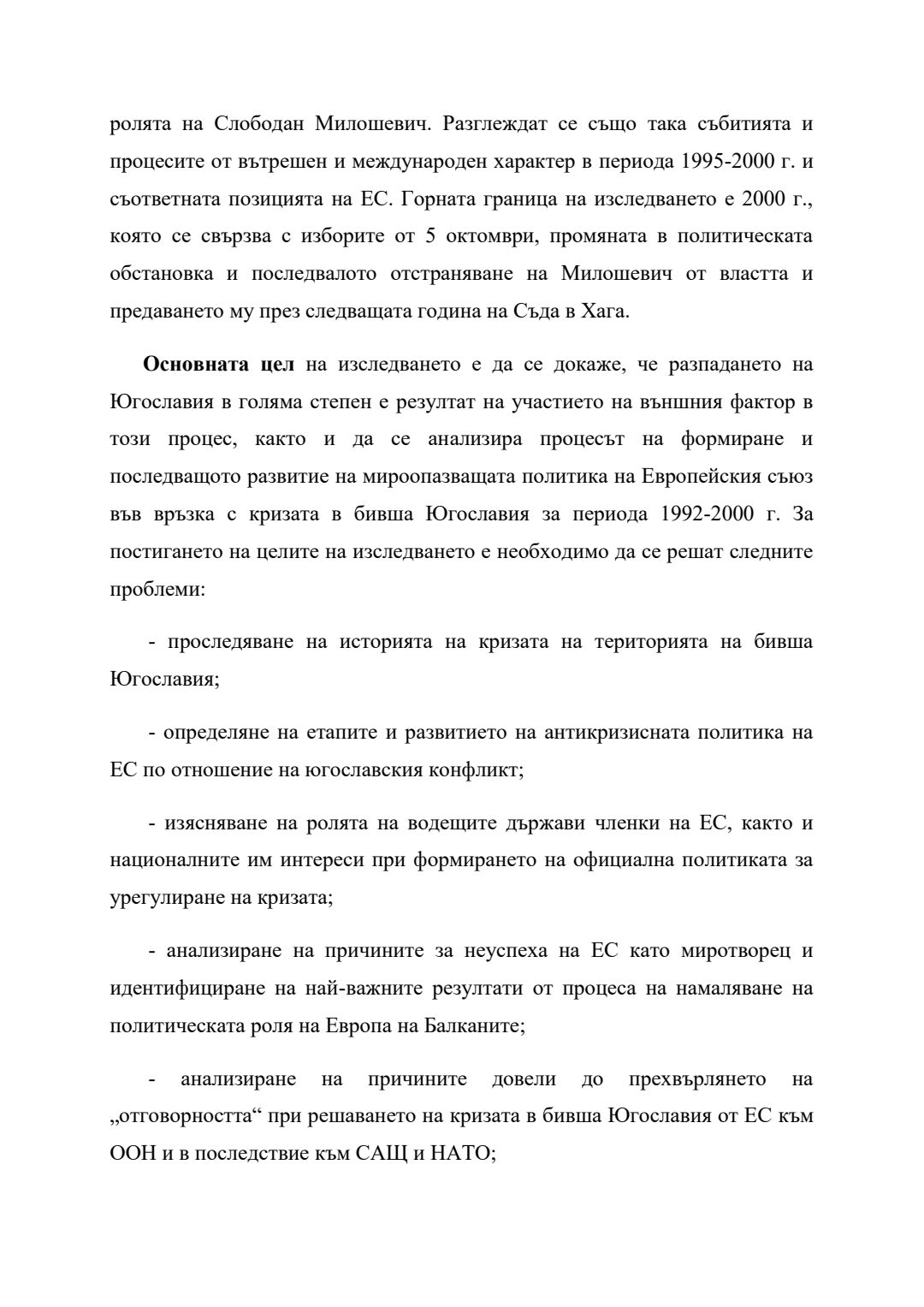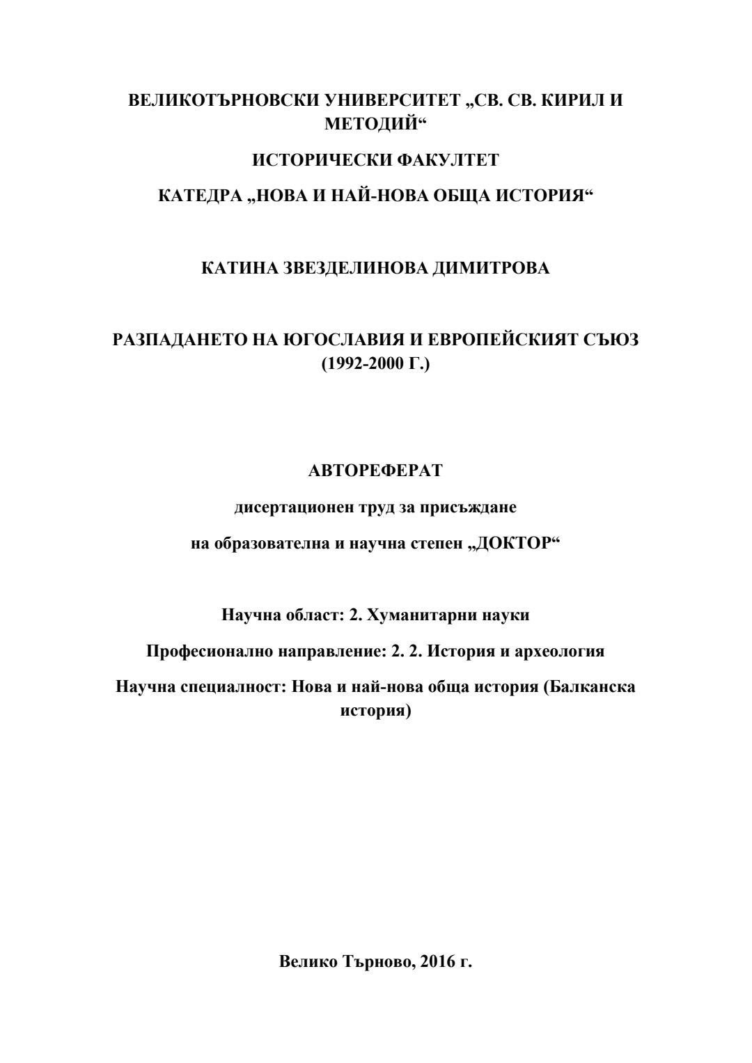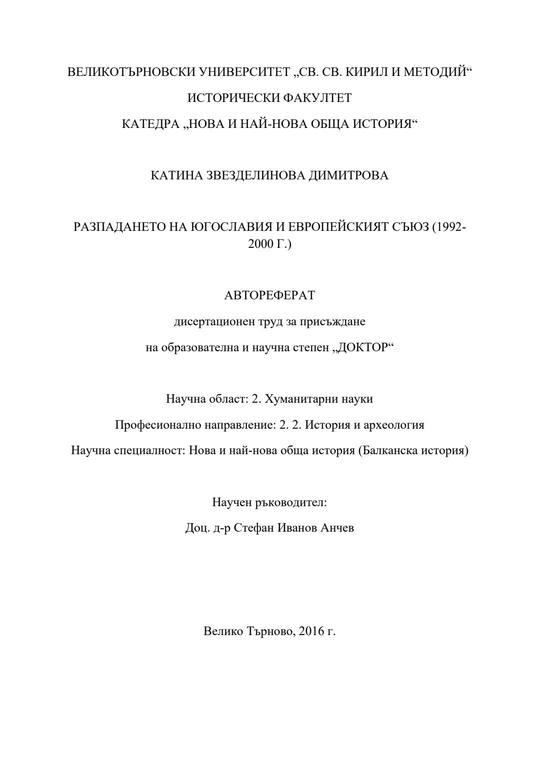 Разпадането на Югославия и Европейският съюз 1992–2000 г. : Автореферат / Катина Звезделинова Димитрова ; Науч. ръководител Стефан Иванов Анчев