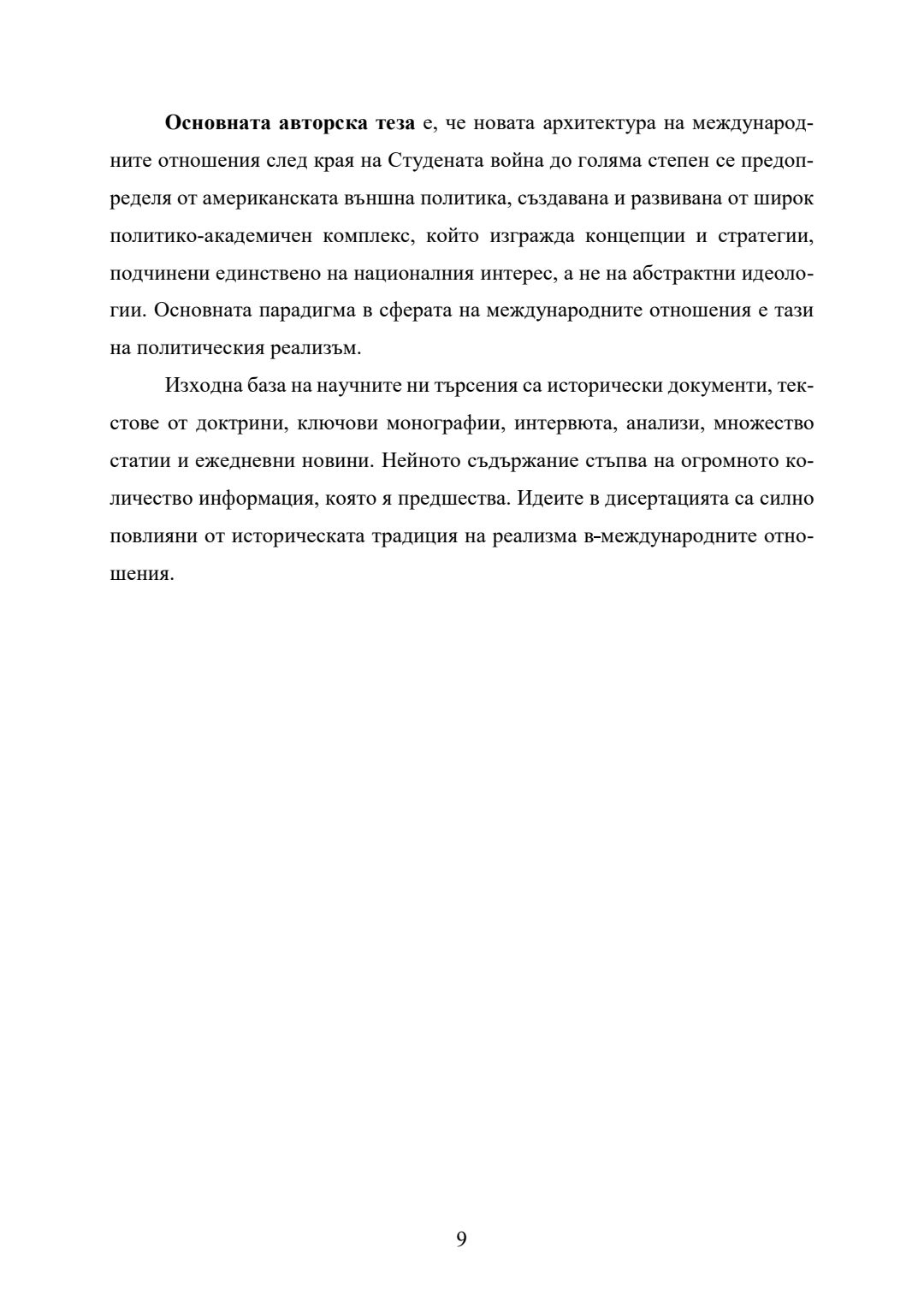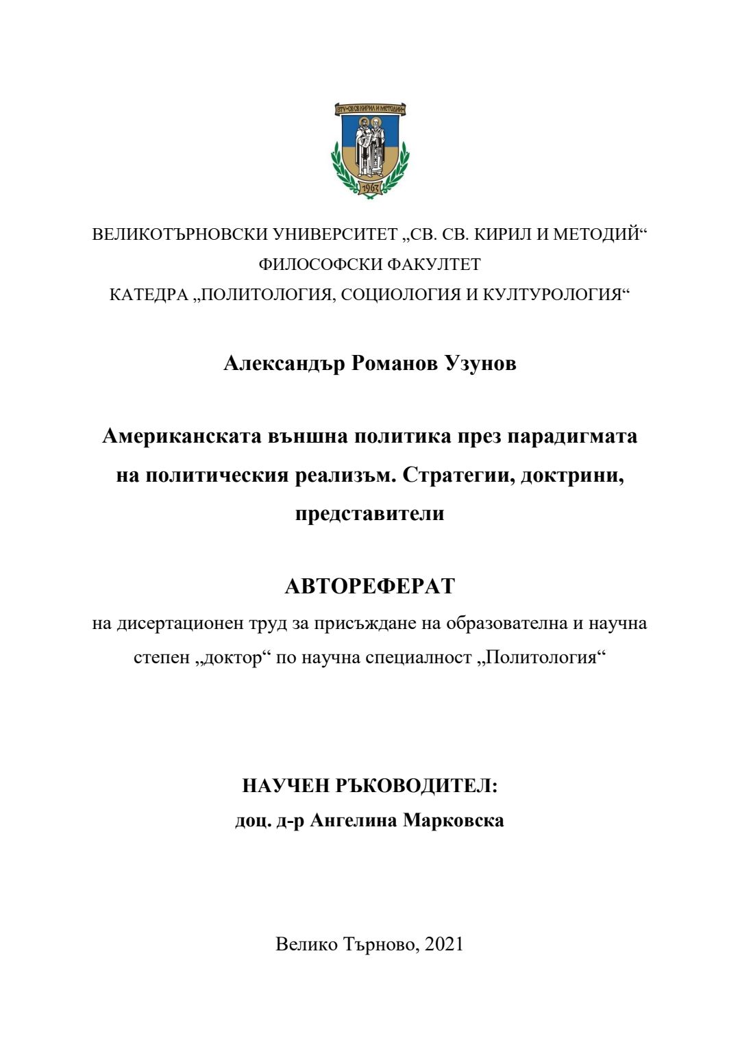 Американската външна политика през парадигмата на политическия реализъм. Стратегии, доктрини, представители : Автореферат / Александър Романов Узунов ; Науч. ръководител Ангелина Марковска