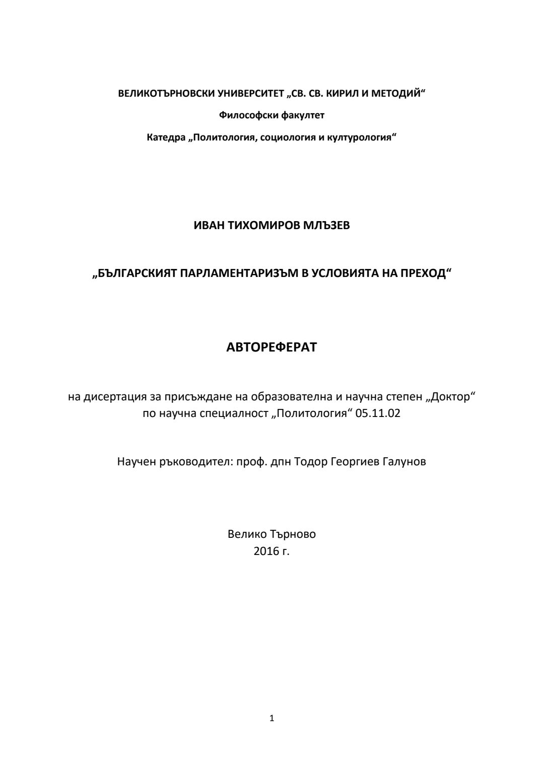 Българският парламентаризъм в условията на преход : Автореферат / Иван Тихомиров Млъзев ; Науч. ръководител Тодор Галунов