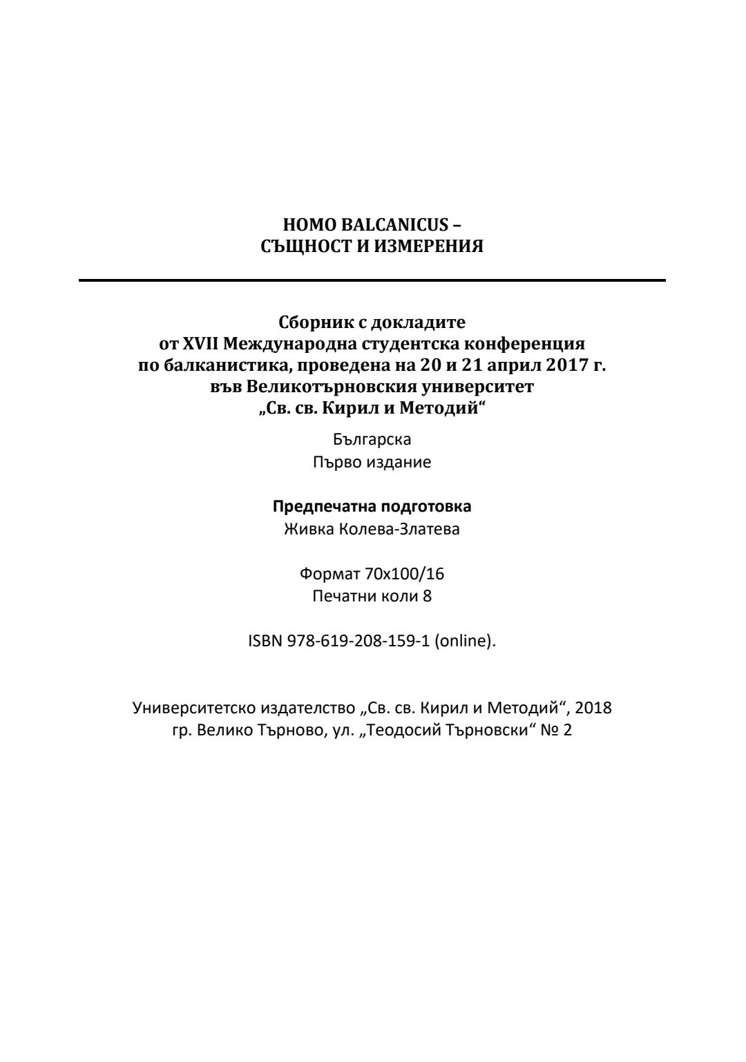 Homo balcanicus – същност и измерения : Сборник с докладите от XVII Международна студентска конференция по балканистика, проведена на 20 и 21 април 2017 г. във Великотърновския университет „Св. св. Кирил и Методий“