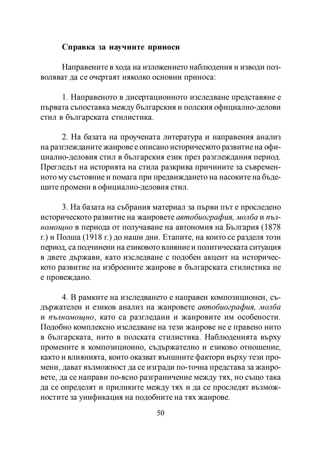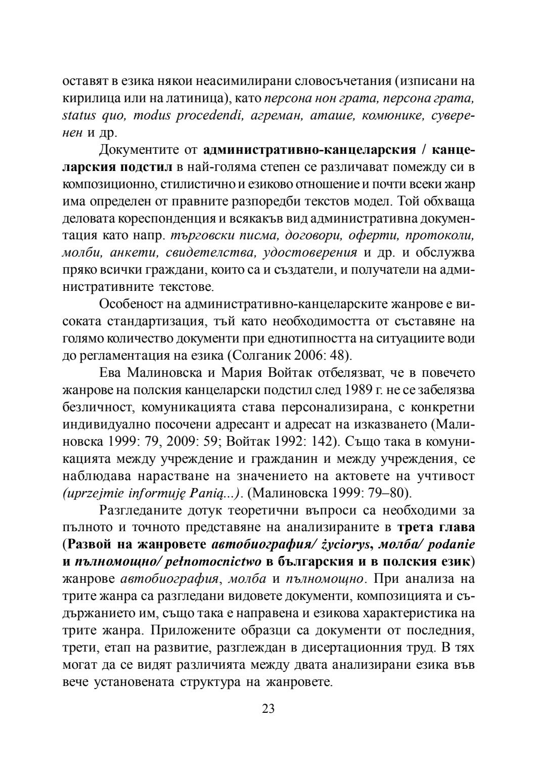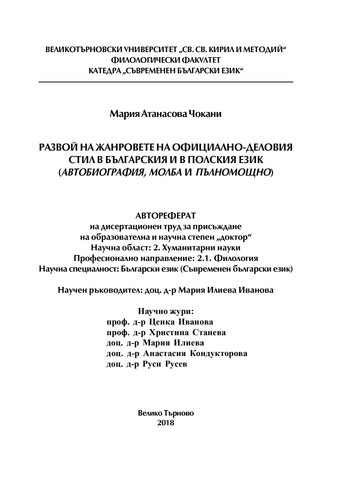Развой на жанровете на официално-деловия стил в българския и полския език (автография, молба и пълномощно) : Автореферат / Мария Атанасова Чокани ; Науч. ръководител Мария Илиева