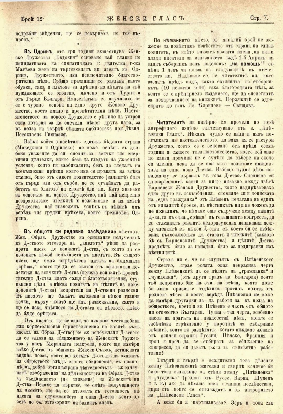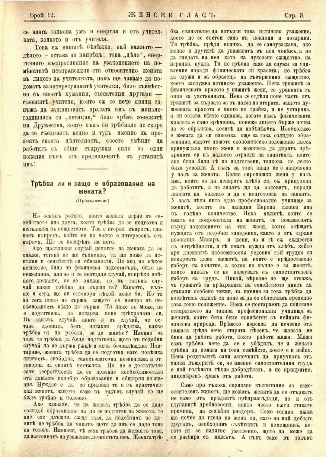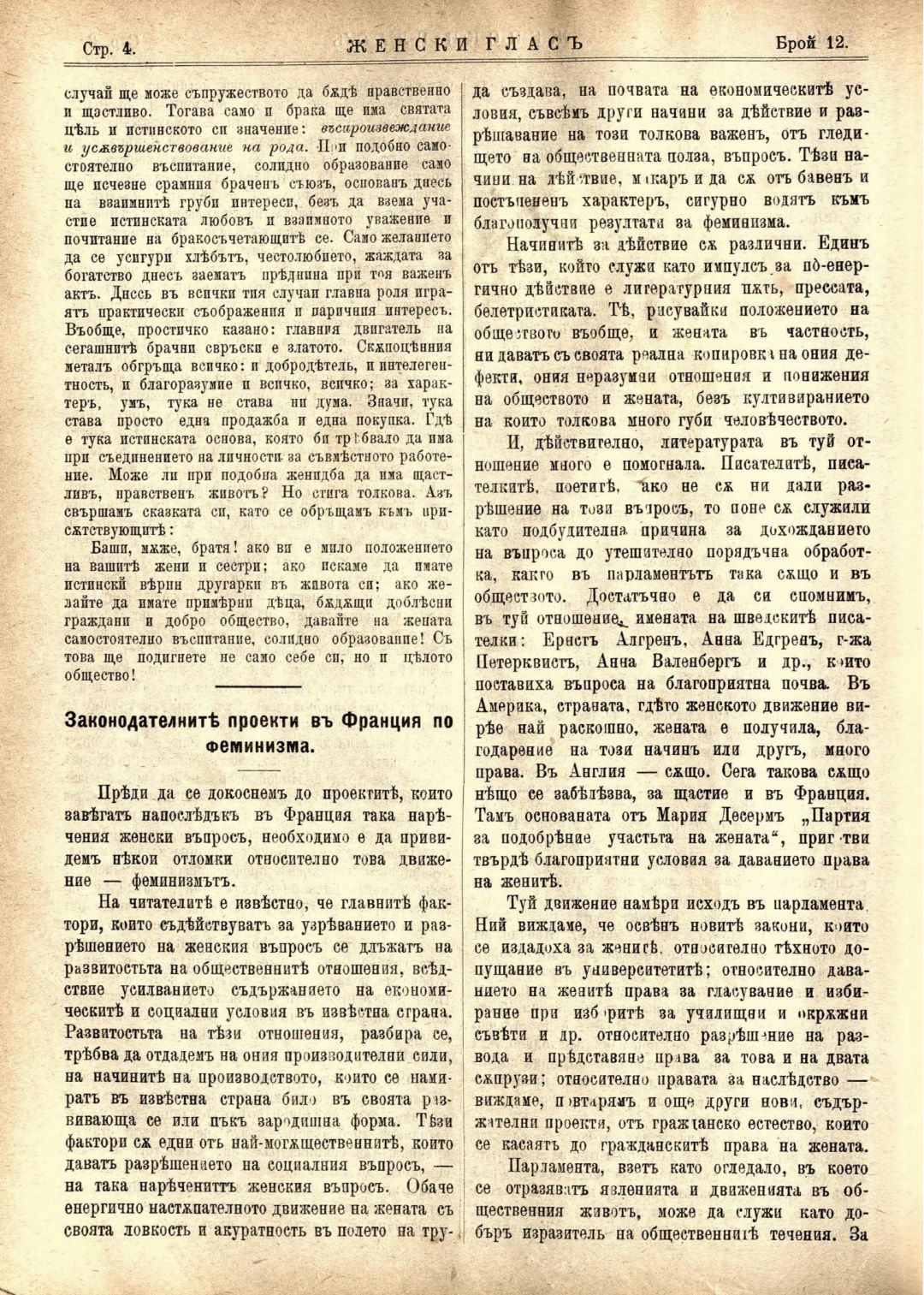Год. 1,№ 12. Женски глас : Орган, посветен на интересите на жената
