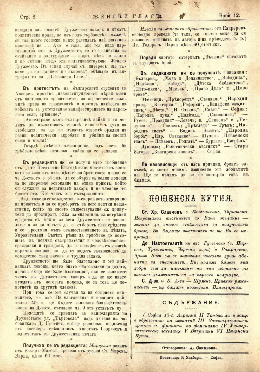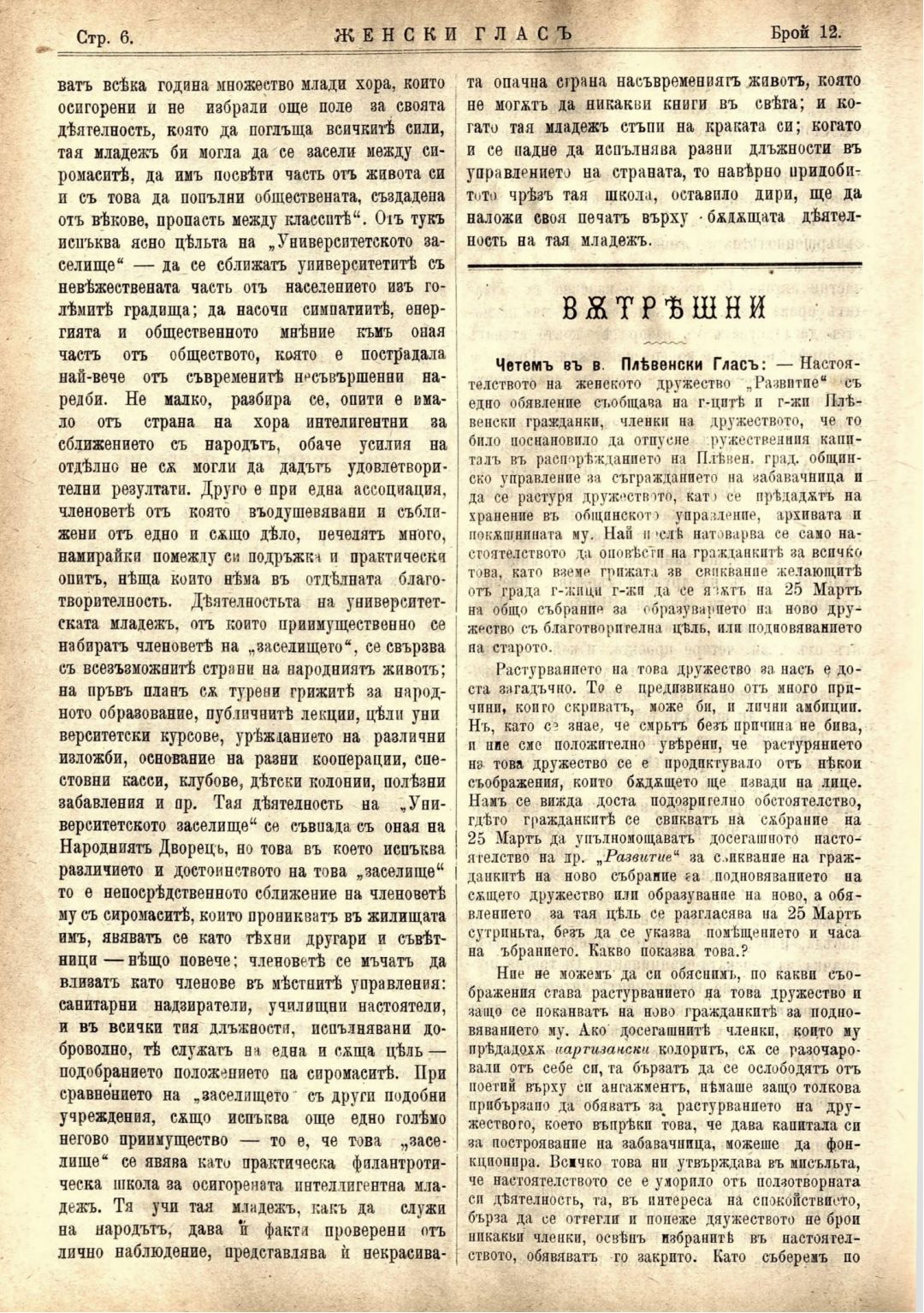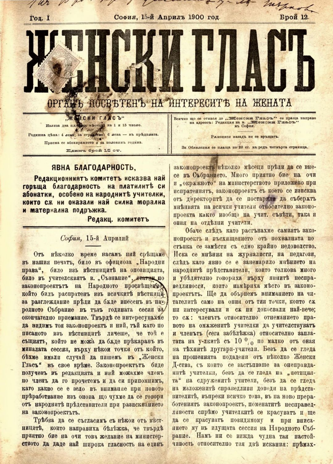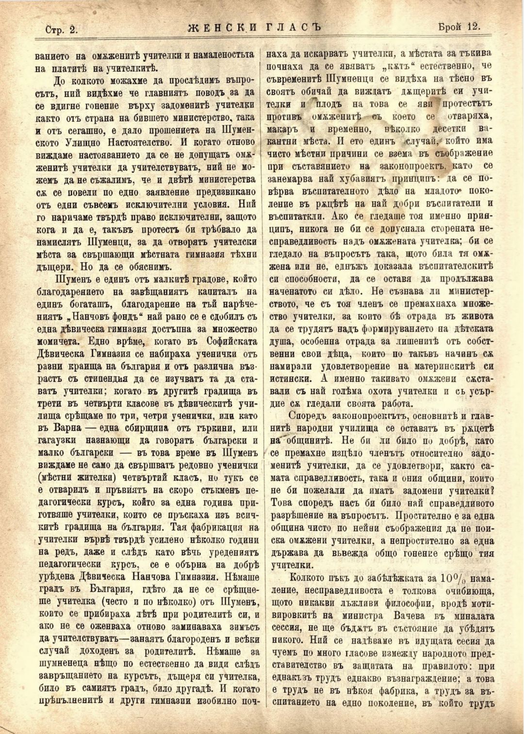 Год. 1,№ 12. Женски глас : Орган, посветен на интересите на жената