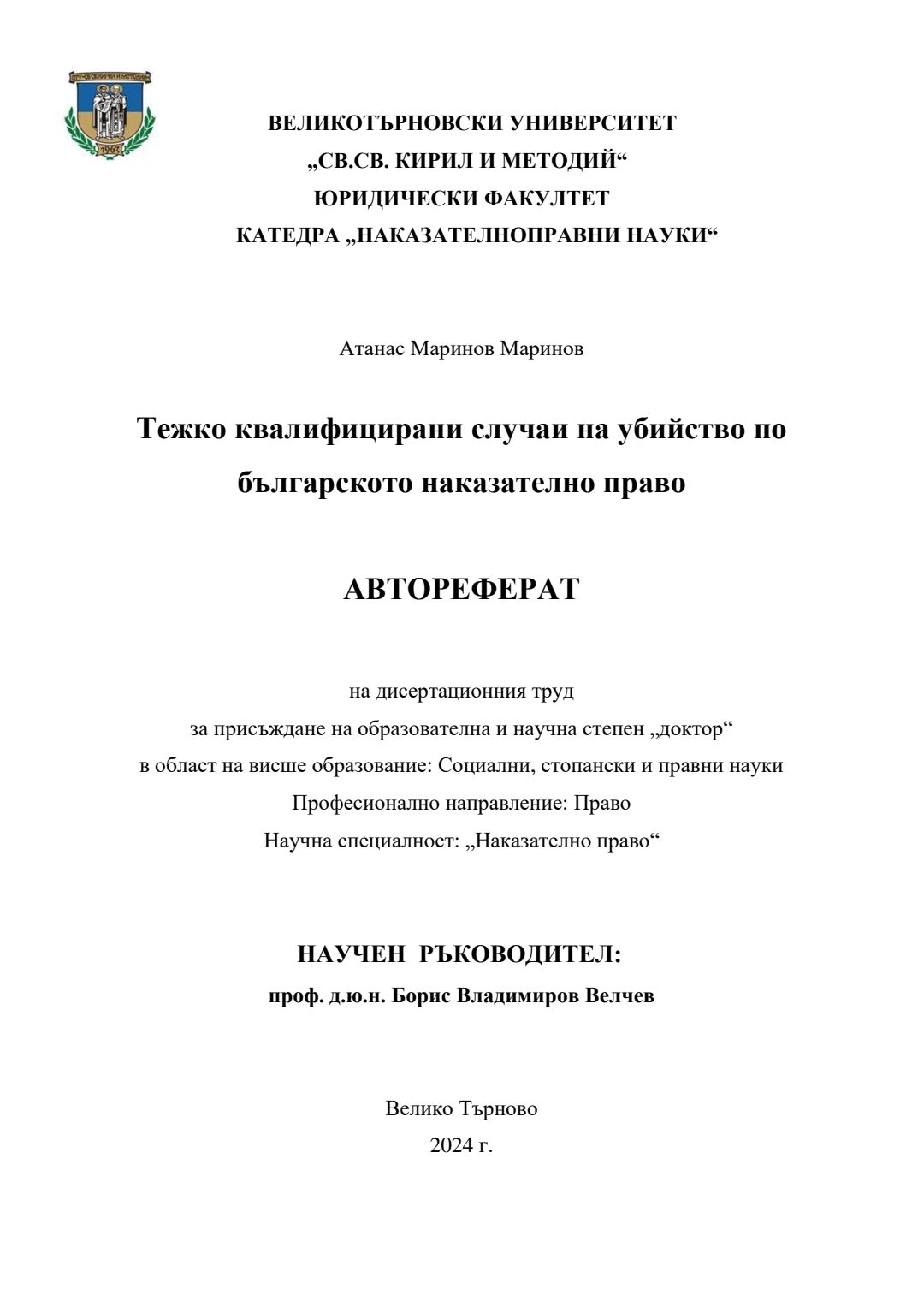 Тежко квалифицирани случаи на убийство по българското наказателно право : Автореферат / Атанас Маринов Маринов ; Науч. ръководител Борис Владимиров Велчев