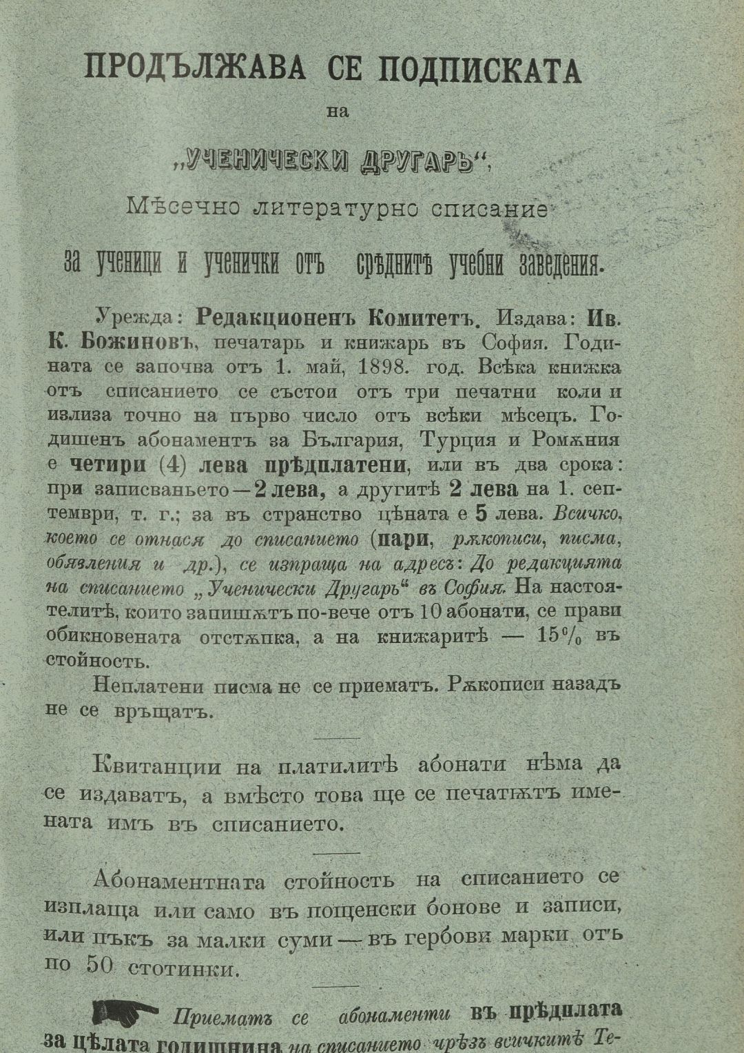 Год. 1, Кн. 3. Ученически другар : Месечно литературно списание за ученици и ученички от средните учебни заведения