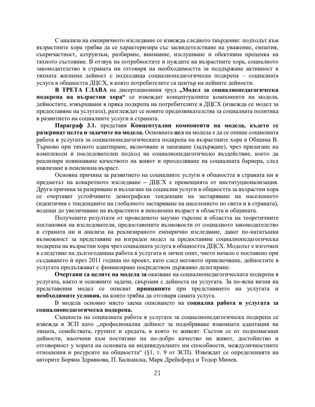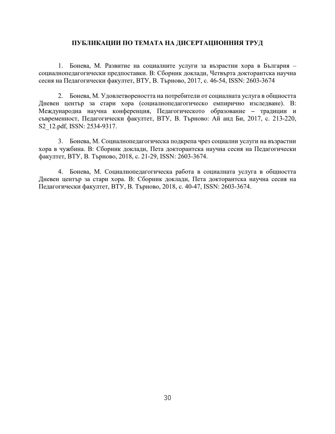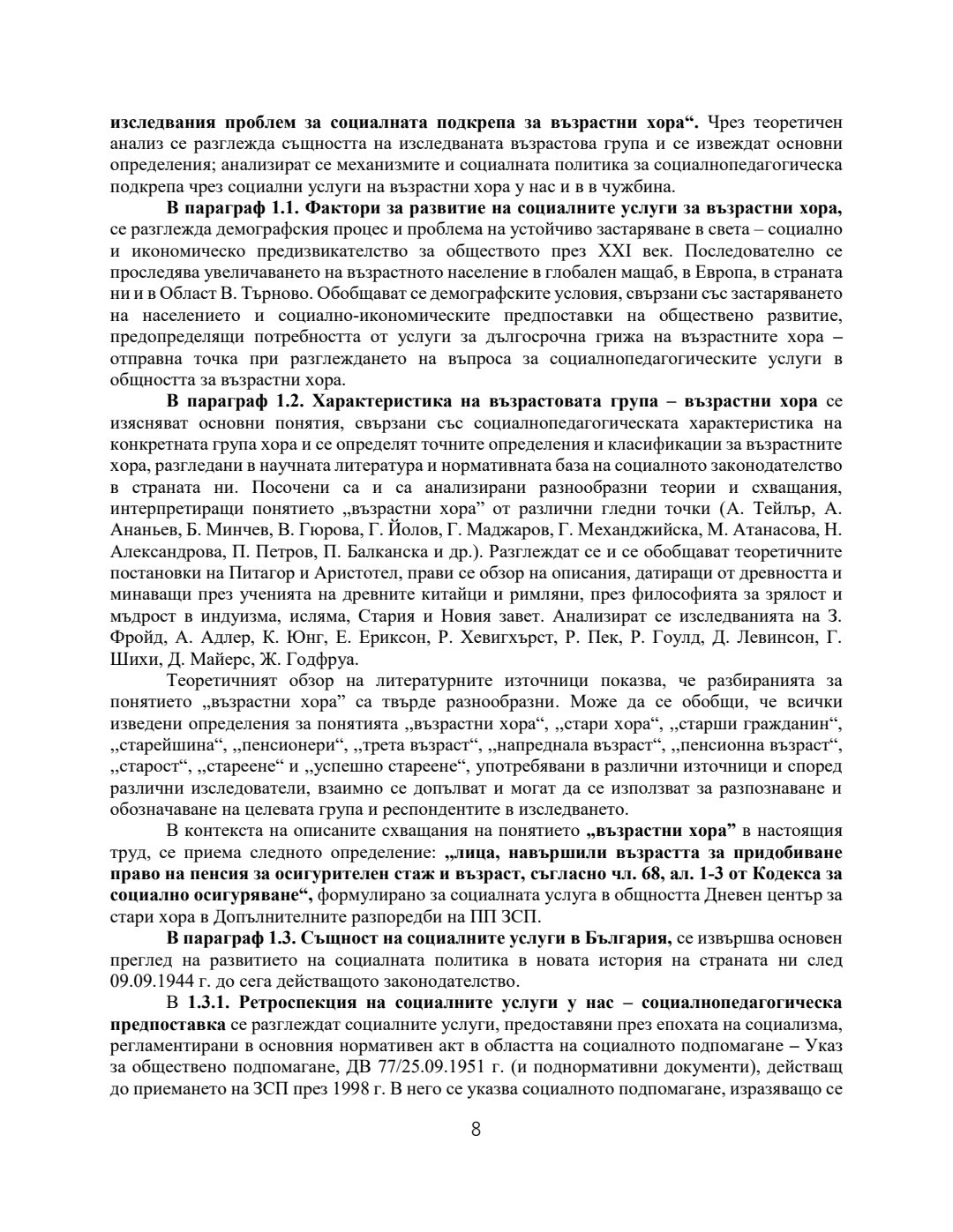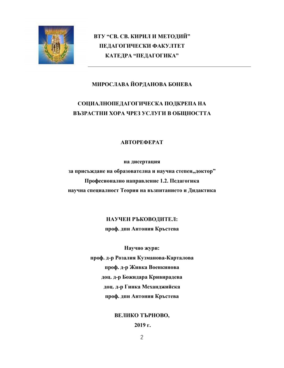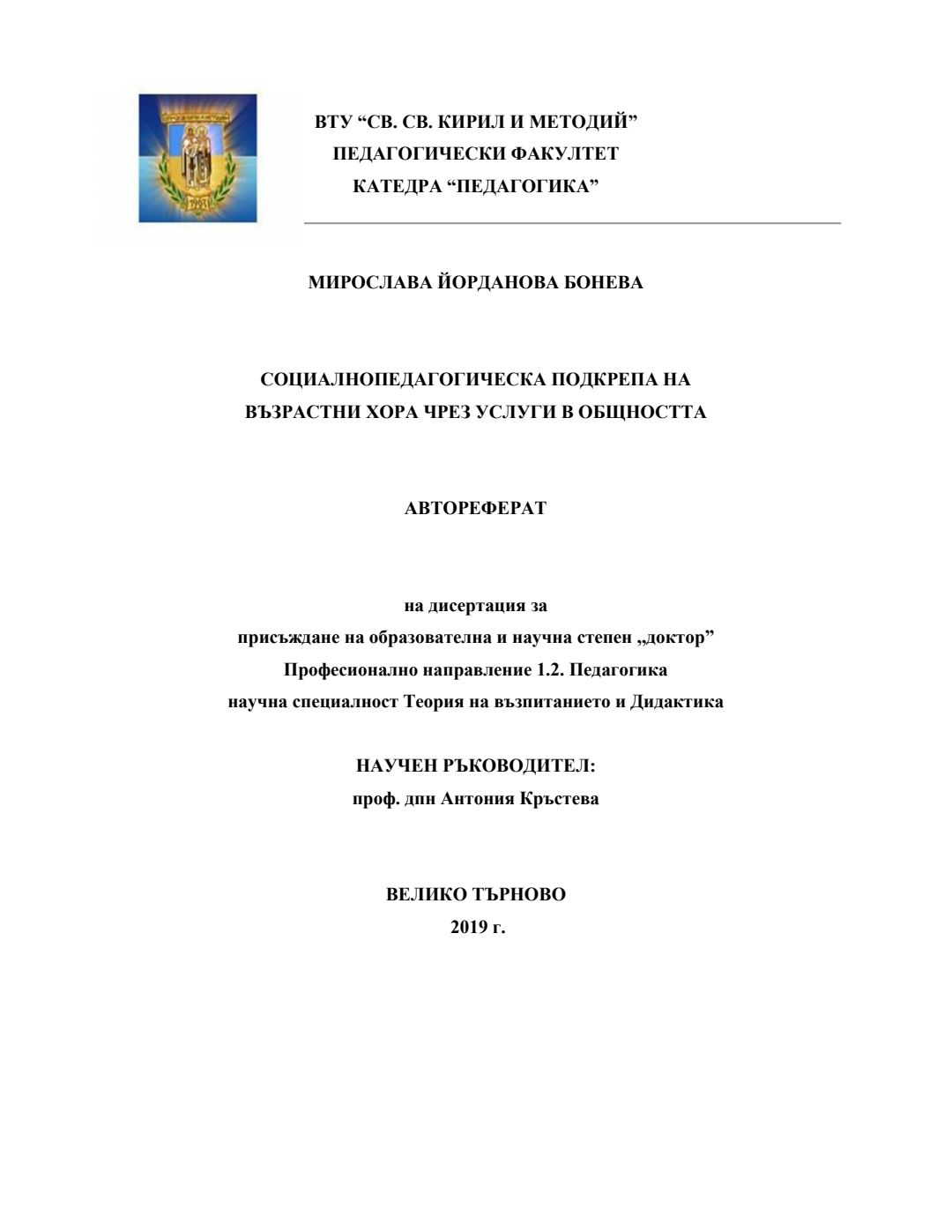 Социалнопедагогическа подкрепа на възрастни хора чрез услуги в общността : Автореферат / Мирослава Йорданова Бонева ; Науч. ръководител Антония Кръстева