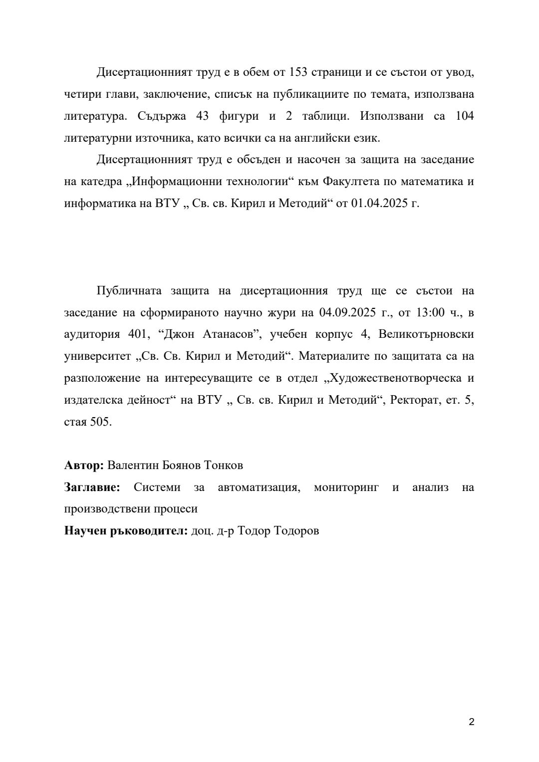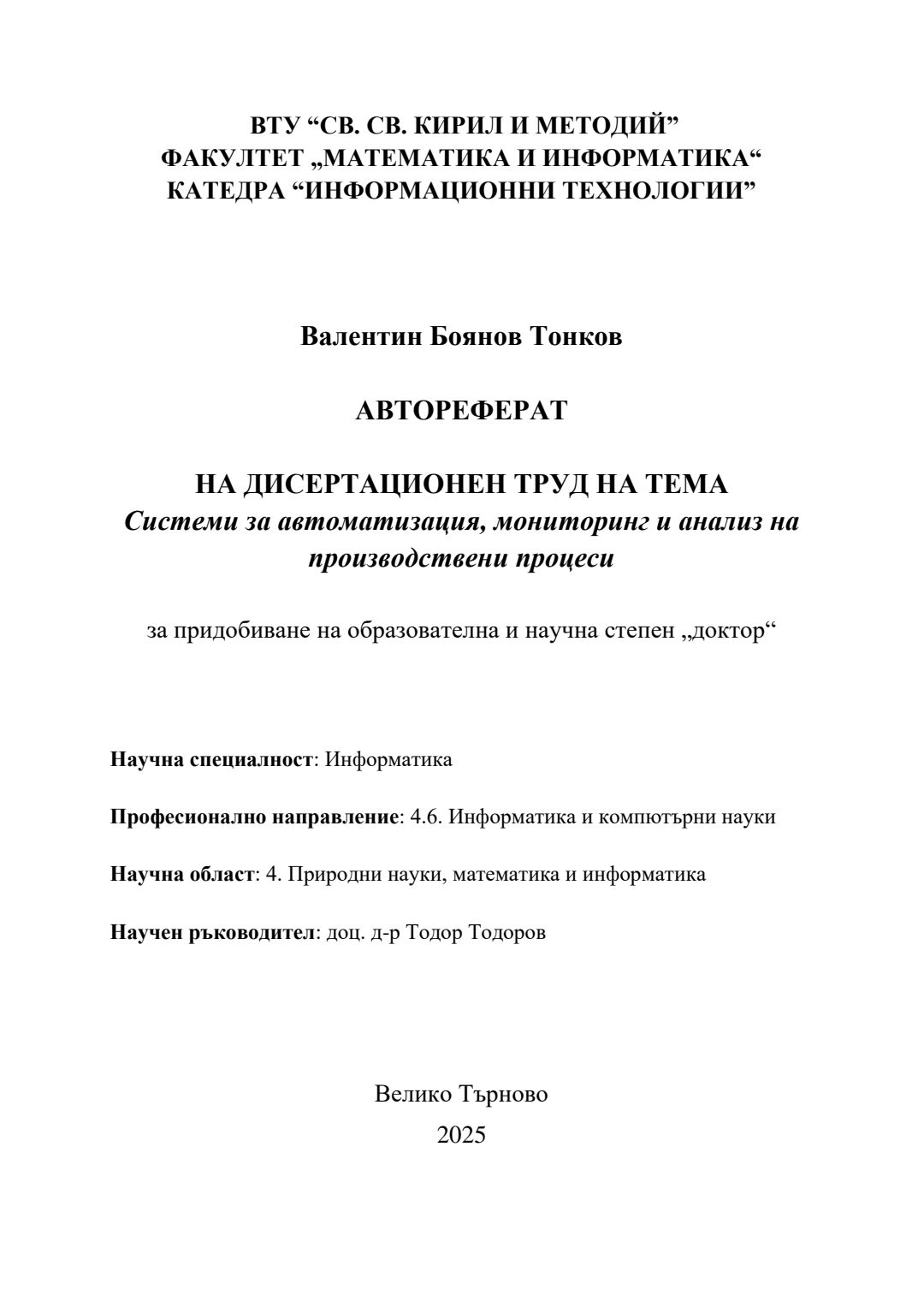 Системи за автоматизация, мониторинг и анализ на производствени процеси : Автореферат / Валентин Боянов Тонков ; Науч. ръководител Тодор Тодоров