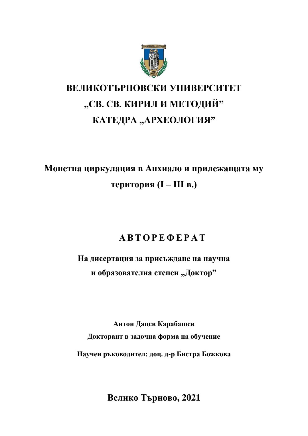 Монетна циркулация в Анхиало и прилежащата му територия (I – III в.) : Автореферат / Антон Дацев Карабашев ; Науч. ръководител Бистра Божкова